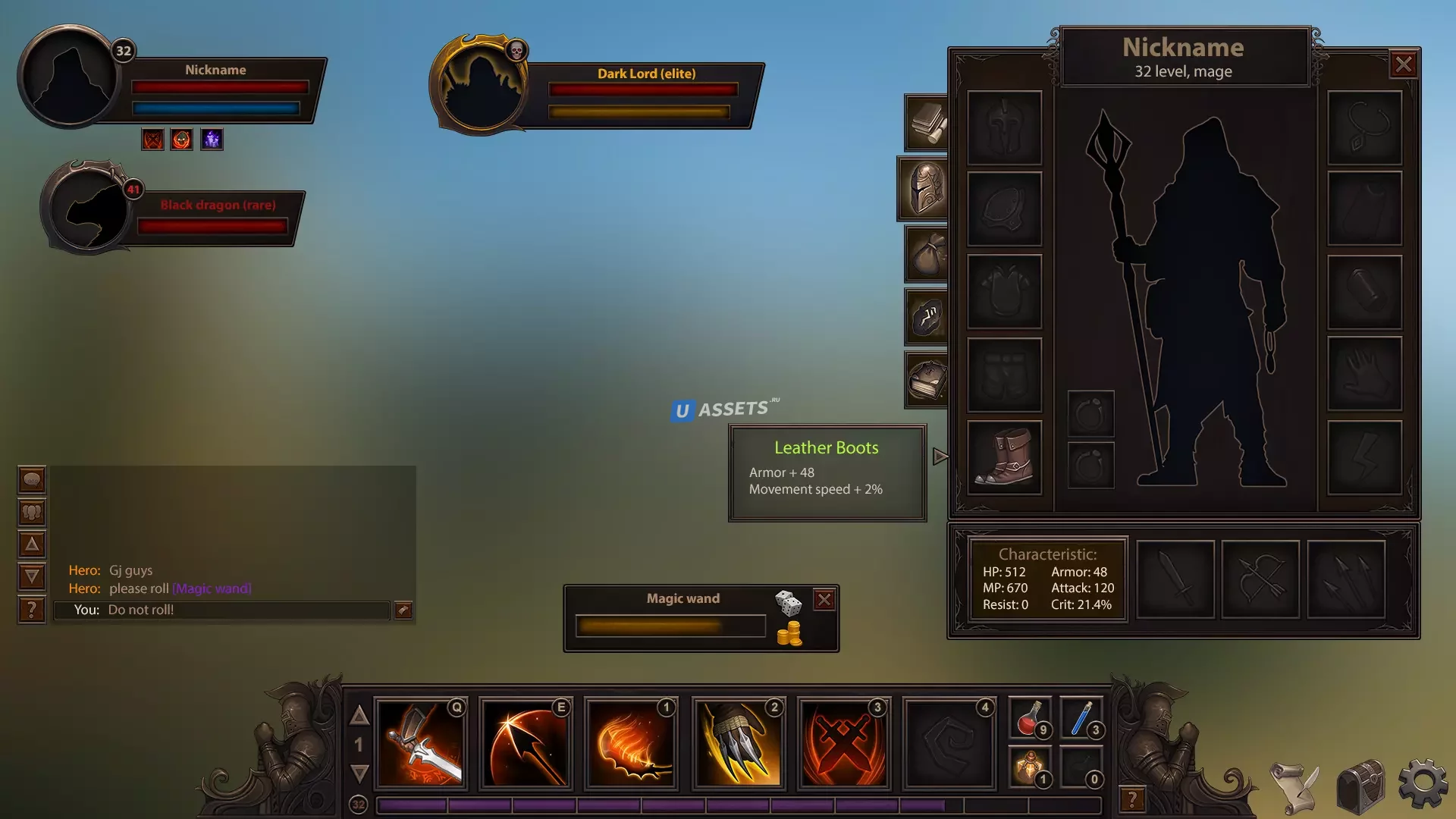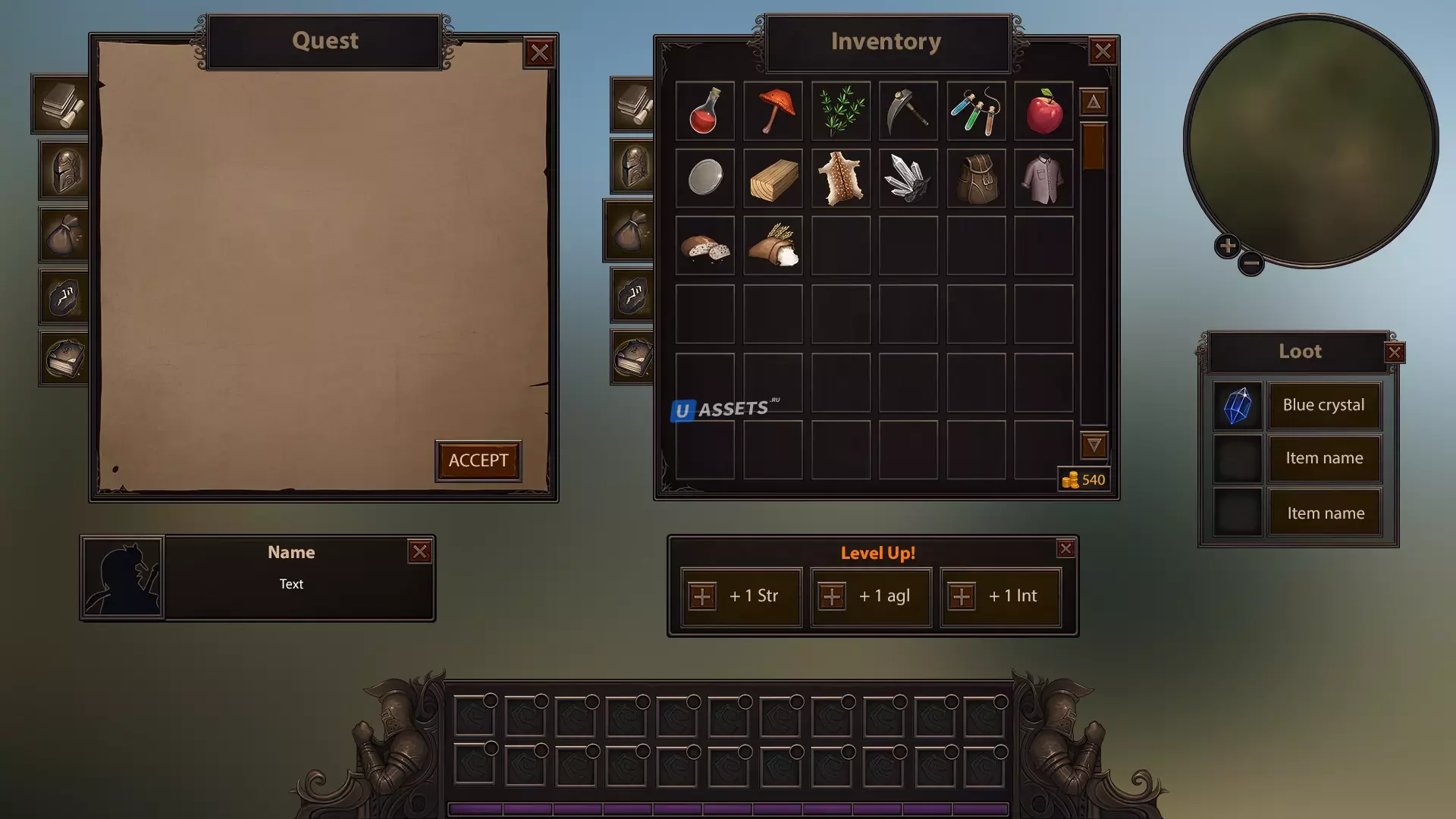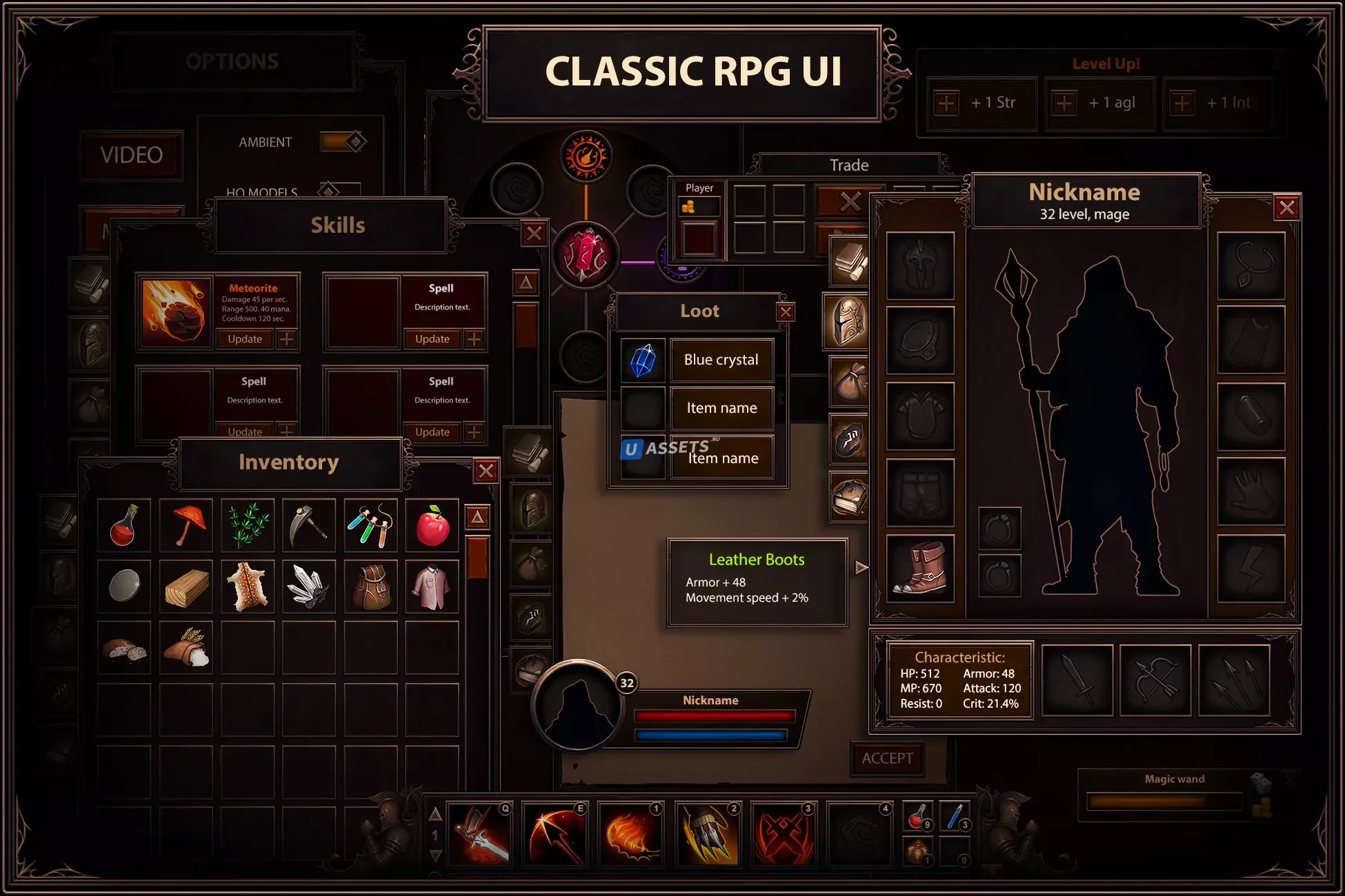 Все элементы раскрашены вручную и идеально подходят для RPG и MMO игр.Этот графический интерфейс включает в себя все основные элементы игрового интерфейса в этом жанре, такие как: меню, опции, бары hp / маны / энергии, инвентарь, кнопки, торговля, книга заклинаний, магазин, квест, панель ботов и т. д.