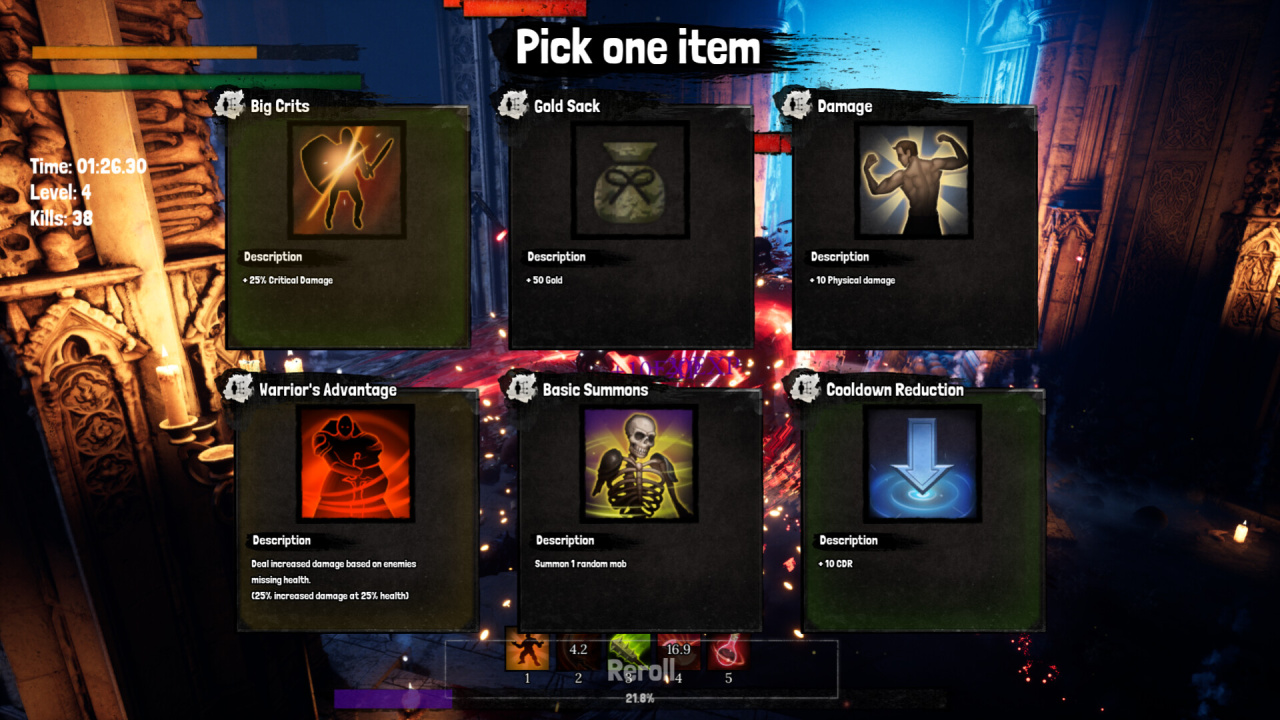 При повышении уровня герою предлагается случайный выбор перков или улучшений характеристик — классическая roguelite-механика, обеспечивающая уникальное развитие каждого прохождения. Игра предлагает два основных режима. В режиме Кампании нужно продержаться 5 минут до появления босса, а победа засчитывается после его уничтожения. Бесконечный режим снимает временные ограничения, измеряя успех общим временем выживания против нескончаемых волн врагов. Сложность постепенно нарастает в обоих вариантах этой захватывающей игры.