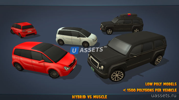 Все модели имеют один и тот же материал и текстуру, атлас 4096*4096, для оптимальной производительности на мобильных устройствах. Количество полигонов для каждой модели составляет около отметки 1 тыс., и каждое транспортное средство имеет отдельные колесные сетки. Все модели имеют собственный сетчатый коллайдер.