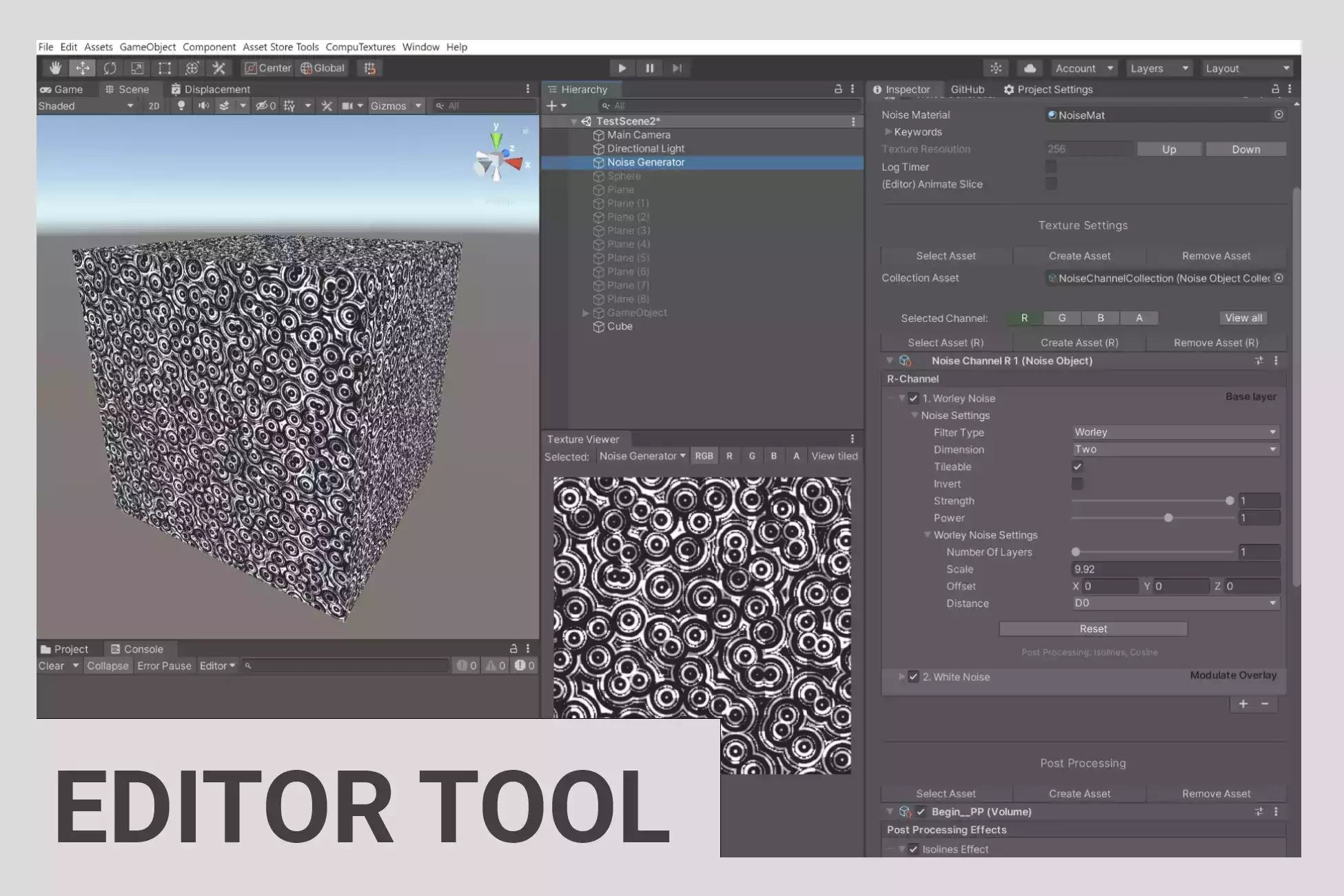 CompuTextures - это генератор текстур, который можно использовать в редакторе Unity. Это позволяет вам создавать пользовательские, настраиваемые, 2D- или 3D-текстуры, которые вы можете преобразовать в различные каналы (RGBA) текстуры.