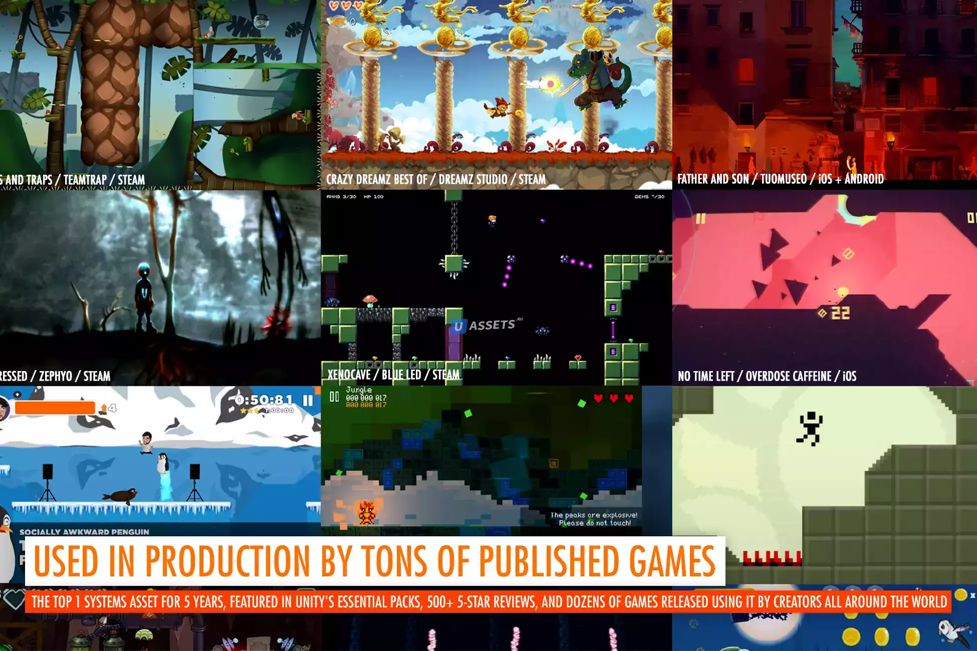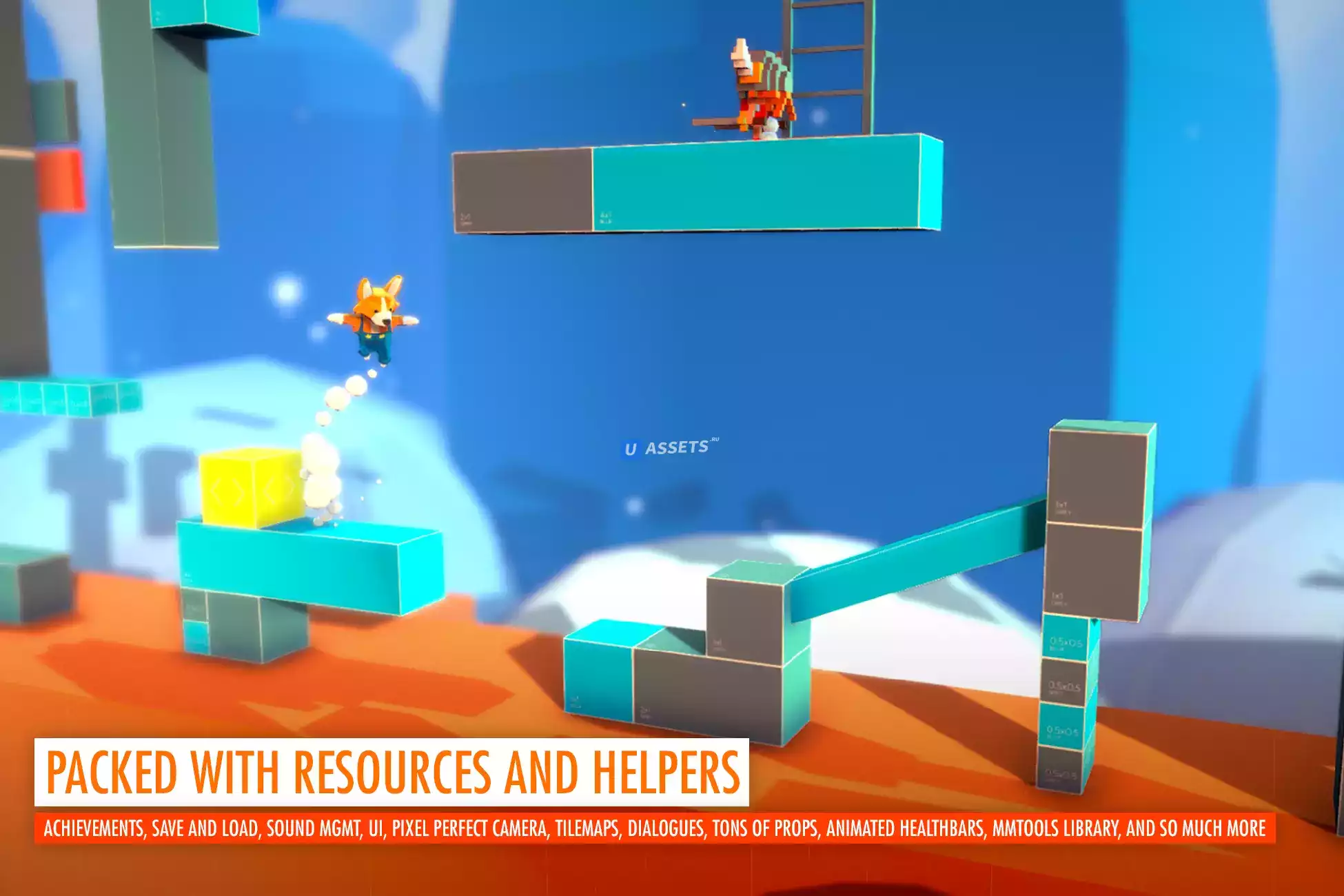 - Наполненный контентом, ресурс содержит более 50 демонстрационных уровней и предоставляет вам все необходимое : более 300 готовых к использованию визуальных ресурсов ручной работы (и которые вы действительно можете использовать, а не только рисунки-заполнители), более 200 оптимизированных сценариев и тонны готовых к производству сборных конструкций.