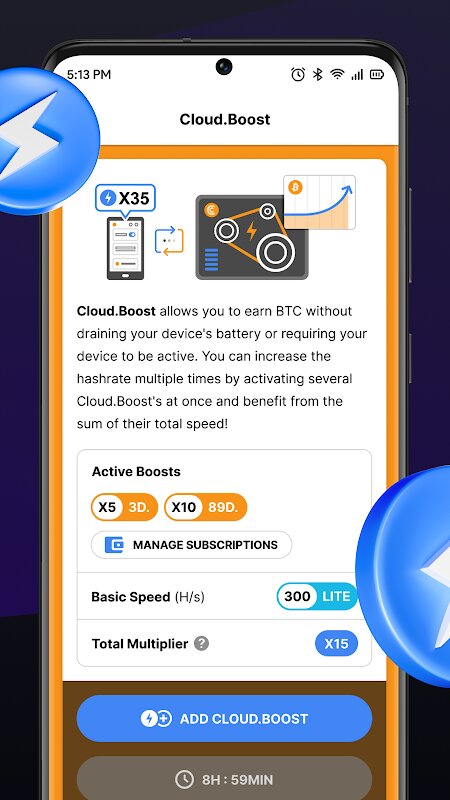 Вы сможете наслаждаться скоростным веб-серфингом, смотреть видео, играть в онлайн-игры или выполнять любые другие привычные задачи в интернете. При этом программа в фоновом режиме позволяет отслеживать ваш хешрейт и доход от майнинга. Через приложение удобно управлять Cloud.Boosts, добавлять неограниченное количество удаленных устройств и наблюдать за ростом баланса в биткоинах. Баланс обновляется каждые 10 минут, а вывод средств доступен мгновенно, без комиссий и без ограничений по количеству операций в сутки.