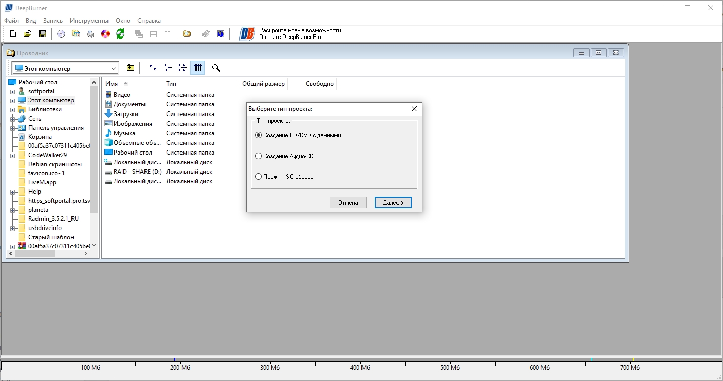DeepBurner - бесплатная версия приложения для записи CD и DVD. Программа поддерживает множество форматов: CD-R / CD-RW / DVD-R / DVD + R / DVD-RW / DVD + RW / DVD-RAM. Содержит все необходимые функции для быстрой и простой записи дисков, а все действия в программе сводятся по сути к перетаскиванию файлов и папок из файлового менеджера в окно, и запуска записи или стирания диска.