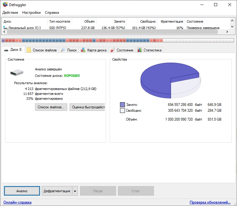 Кроме прочего, Defraggler умеет отображать информация о накопителе, например, его пустые или фрагментированные области, выполнять поиск файлов на диске, а также вести статистику по дискам.