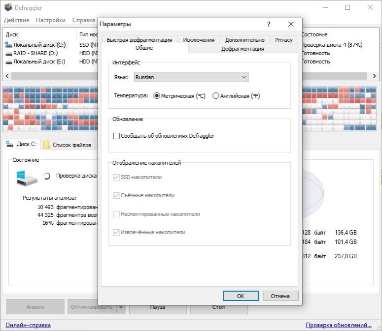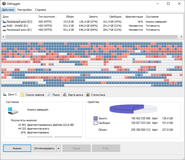 Defraggler - это простой программный инструмент для быстрой дефрагментации жестких дисков, поддерживает как жесткие диски HDD, так и твердотельные накопители SSD с файловыми системами NTFS и FAT32.