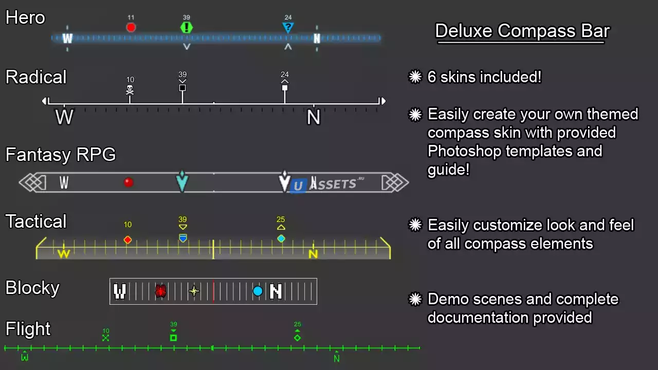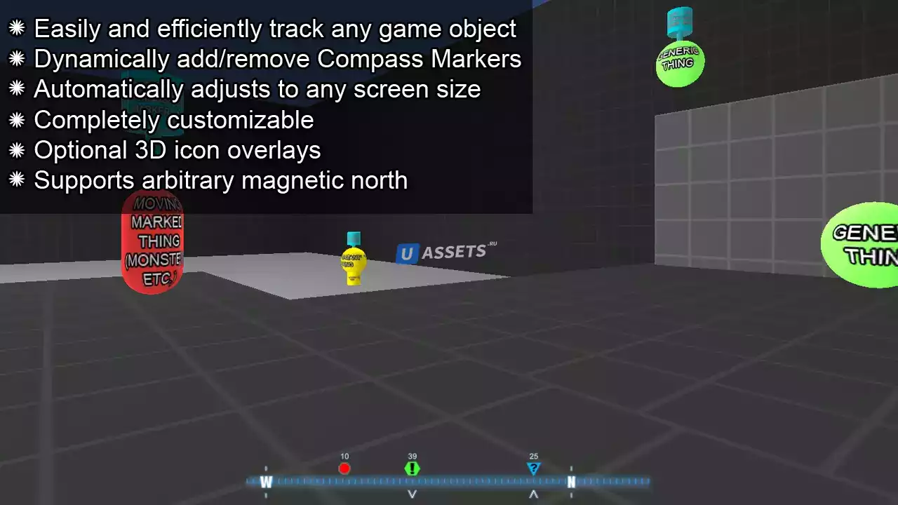 Графический интерфейс и пакет скриптов для включения в вашу игру графического интерфейса компаса и отслеживания объектов. Динамически добавляйте / удаляйте маркеры, чтобы легко и эффективно отслеживать любой игровой объект на вашем компасе.