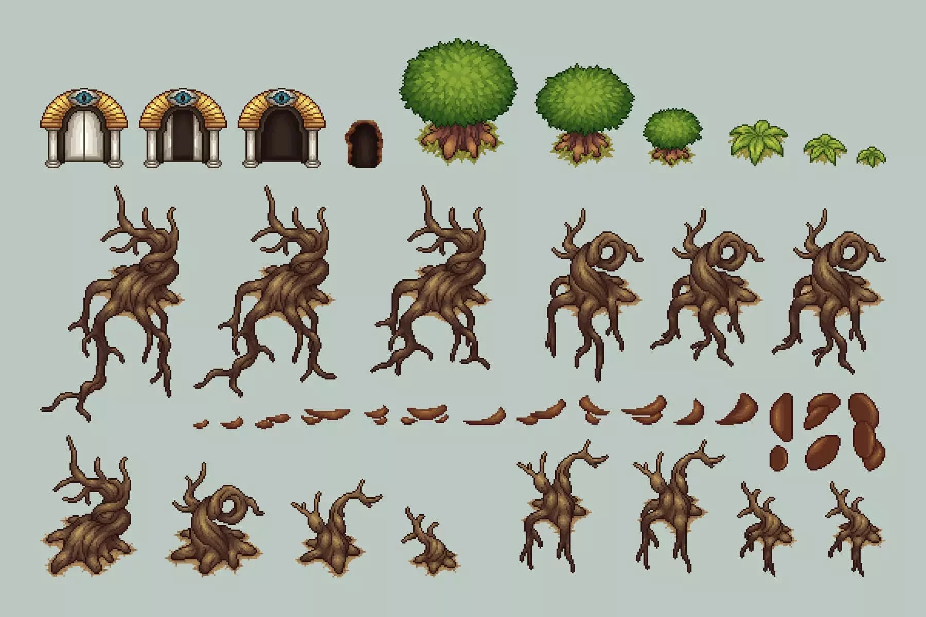 Создайте мир, наполненный странными существами, новой расой, заполонившей пустыню, в которой величественному игроку придется пройти через все тяготы и страдания, чтобы достичь желаемого результата. Благодаря популярному стилю пиксельной графики, вы легко сможете соответствовать любому популярному жанру 2D-игр. RPG, раннеры, пошаговые стратегии, выживание, MMO-RPG, квесты, и это особенно хорошо для жанра "Сверху вниз". Кроме того, вы можете легко редактировать и изменять внешний вид и общую структуру каждого элемента в этом пакете. Например, изменить цвет, масштаб или уменьшить размер плиток, встроить подсветку ворот и многое другое. Для этого вам подойдет простой редактор Adobe Photoshop.
