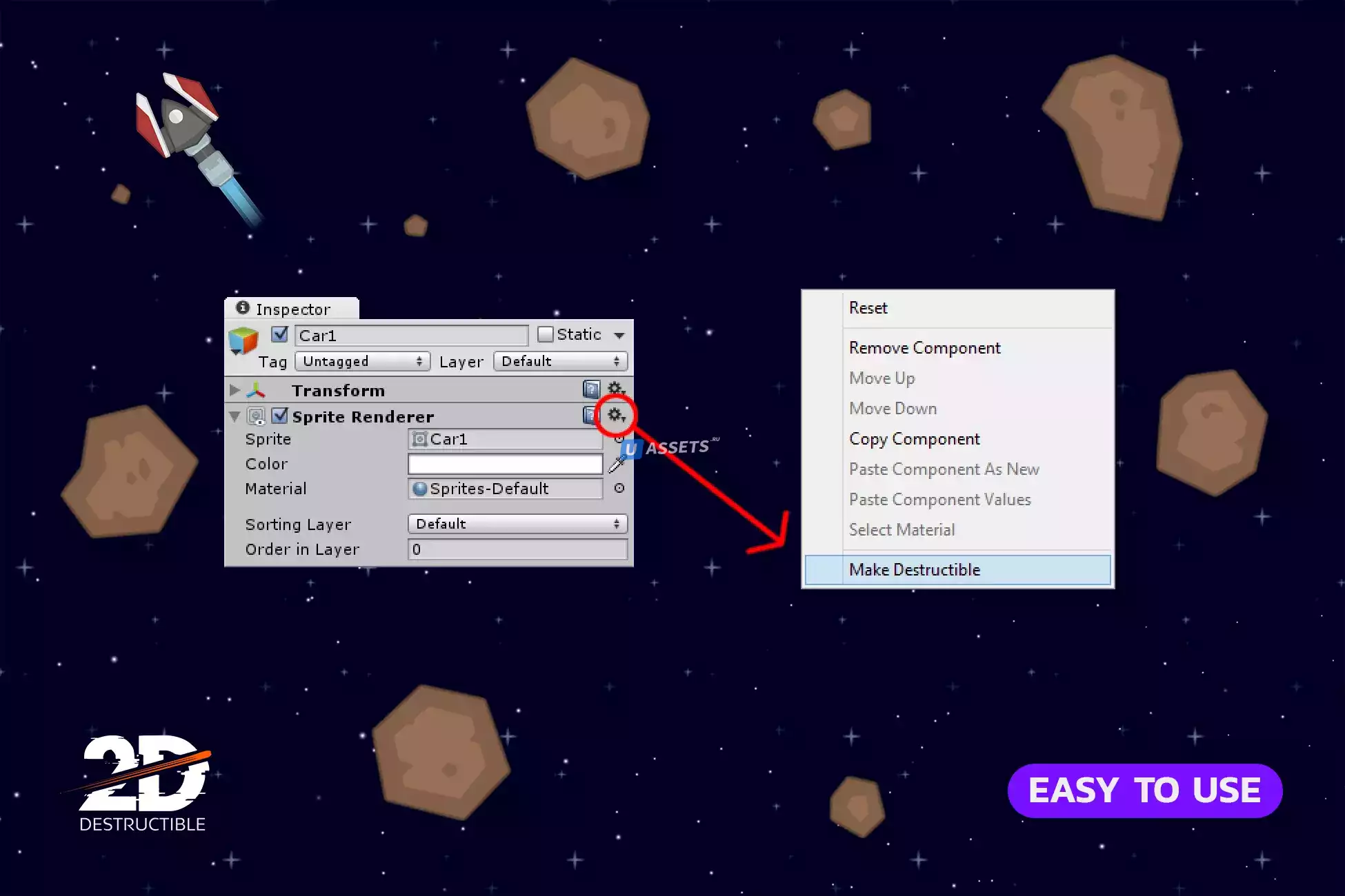 Раскройте весь потенциал своих 2D-игр с помощью Destructible 2D. Этот ассет позволит вам быстро превратить все ваши скучные сплошные спрайты в полностью разрушаемые!