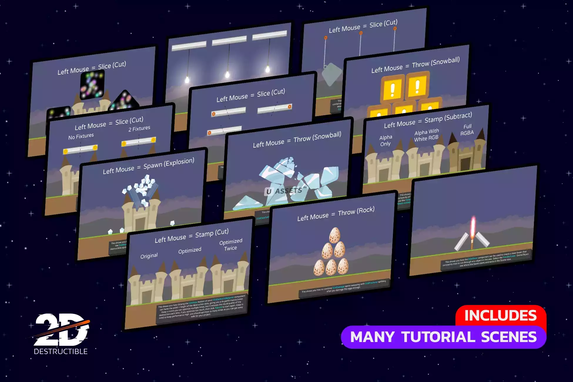 💡 Множество демонстрационных сцен ― Destructible 2D включает в себя широкий спектр обучающих демонстрационных сцен, которые пошагово знакомят вас с каждой функцией. Эти сцены содержат текст с подробным описанием, в котором объясняется, что показывается, какие компоненты были использованы и какие настройки были использованы.