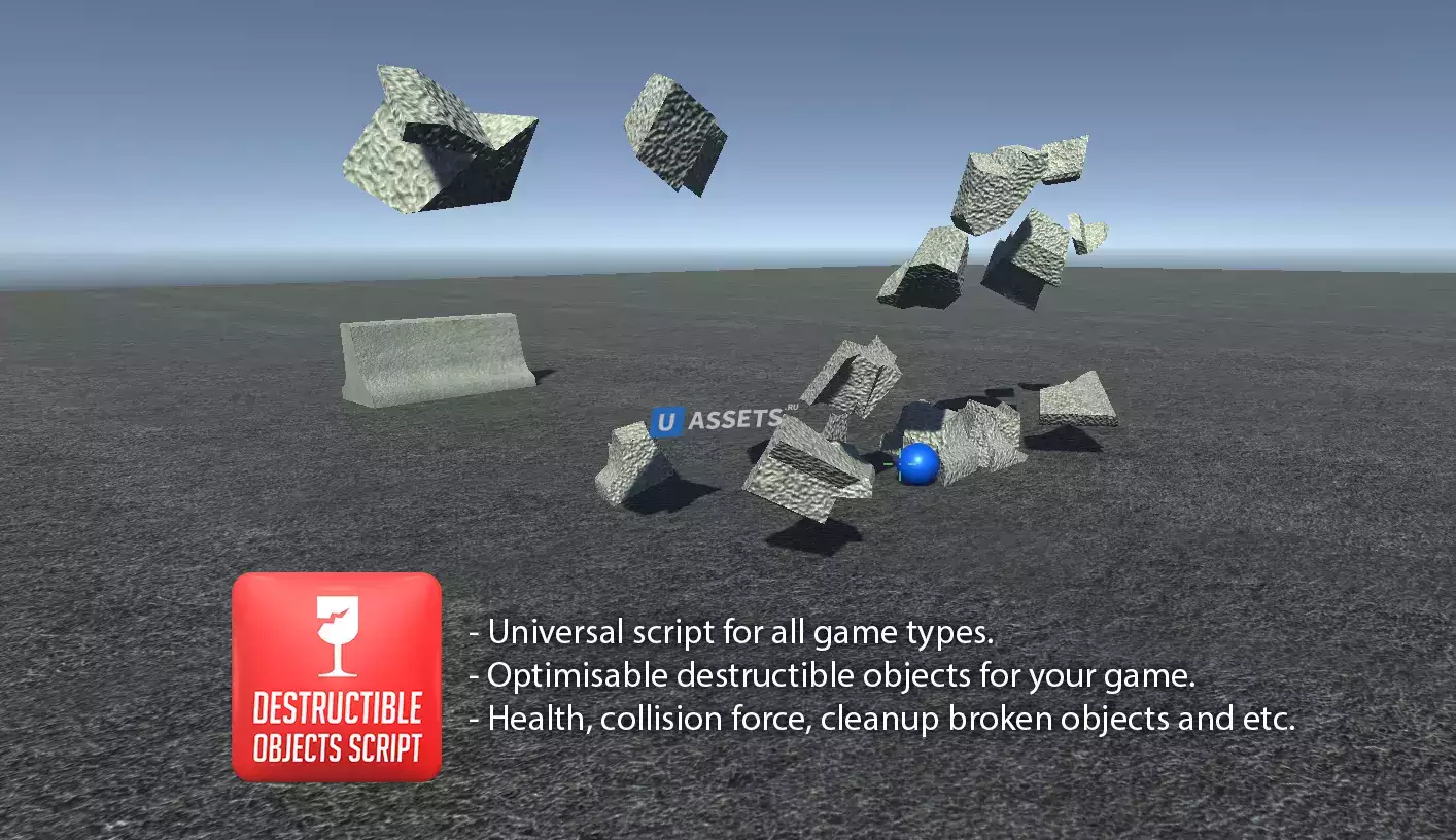 * Это не разрушаемый скрипт в реальном времени, этот ресурс работает с префабами. Бесплатный плагин Voronoi используется для создания разрушаемых сборных блоков. Скрипт разрушаемых объектов – универсальный оптимизированный скрипт, с помощью которого вы можете создавать свои собственные разрушаемые объекты в своей игре.