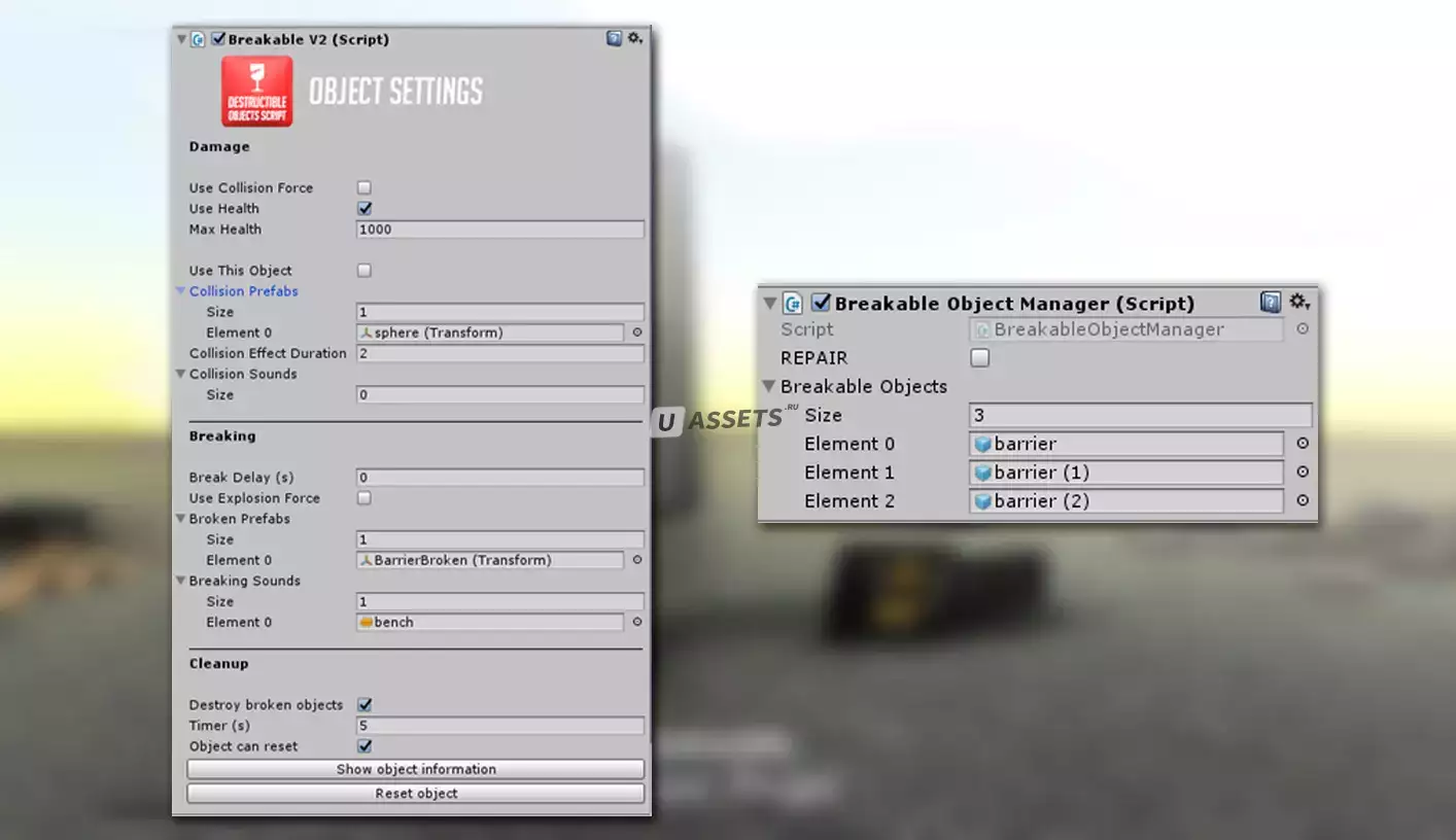 В каждом объекте можно регулировать силу столкновения, здоровье, силу взрыва, звуки столкновения, звуки разрушения, очистку разбитых объектов, задержку разрыва, сборные конструкции столкновения, сломанные сборные конструкции.