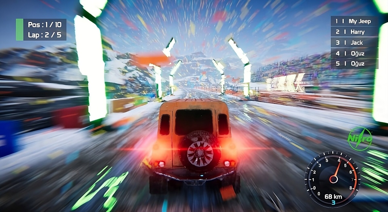 Состязания с соперниками определяют значительную часть геймплея. Гонщики преследуют оппонентов в поисках оптимальной траектории для обгона и захвата преимущества. Агрессивные маневры, включая использование массы внедорожника для тарана конкурентов, считаются приемлемой тактикой. Ландшафт усеян высокими трамплинами, позволяющими взлетать в воздух для выполнения трюков и тактического позиционирования. Успех зависит от умения использовать любую возможность: от стратегического вождения и прямого столкновения до эксплуатации особенностей окружения.