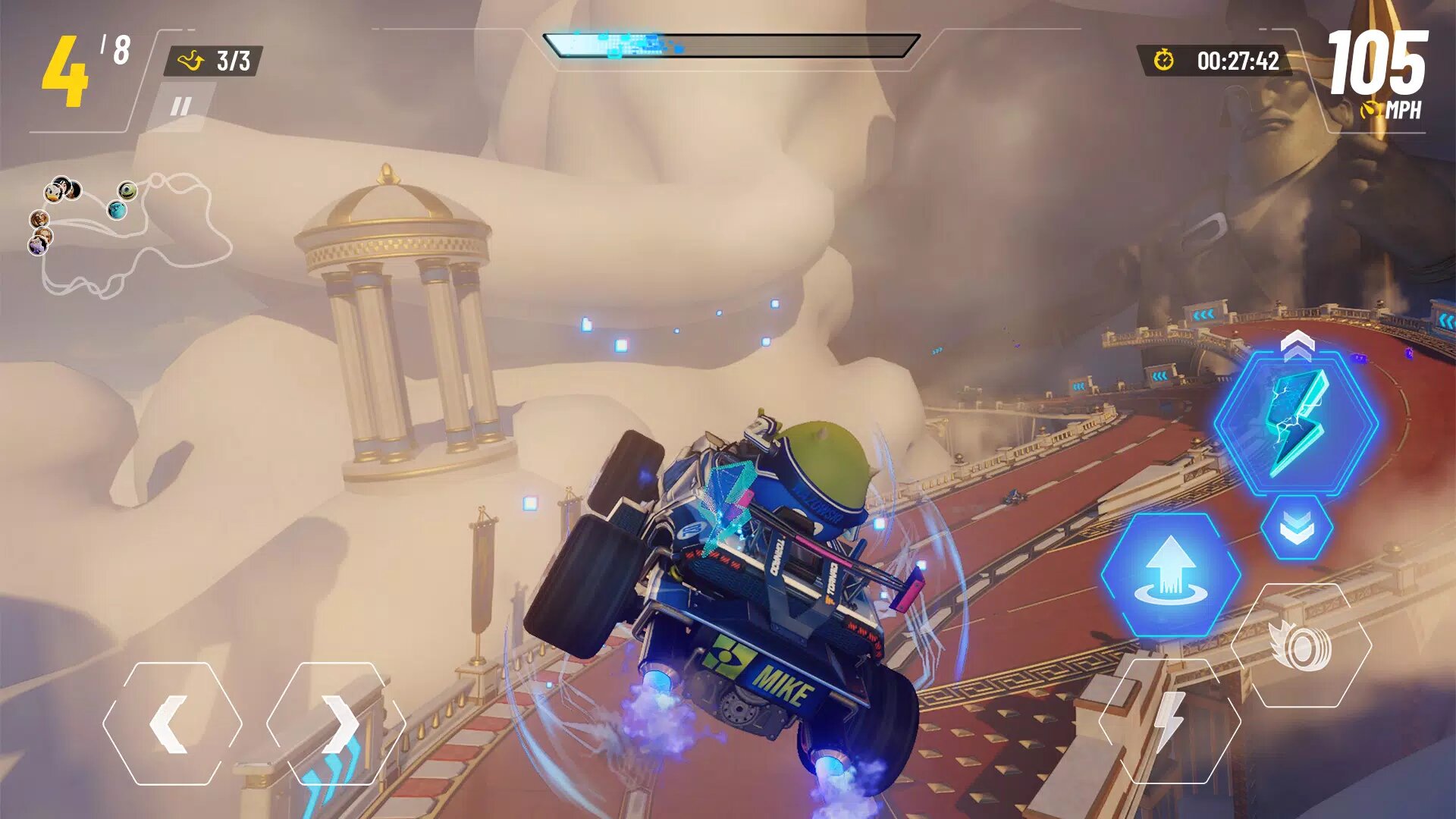 Создайте неповторимый стиль для своего гонщика и его болида. Выбирайте из множества костюмов, ярких раскрасок для карта, а также разнообразных колесных дисков и спойлеров, чтобы выделиться на трассе.
