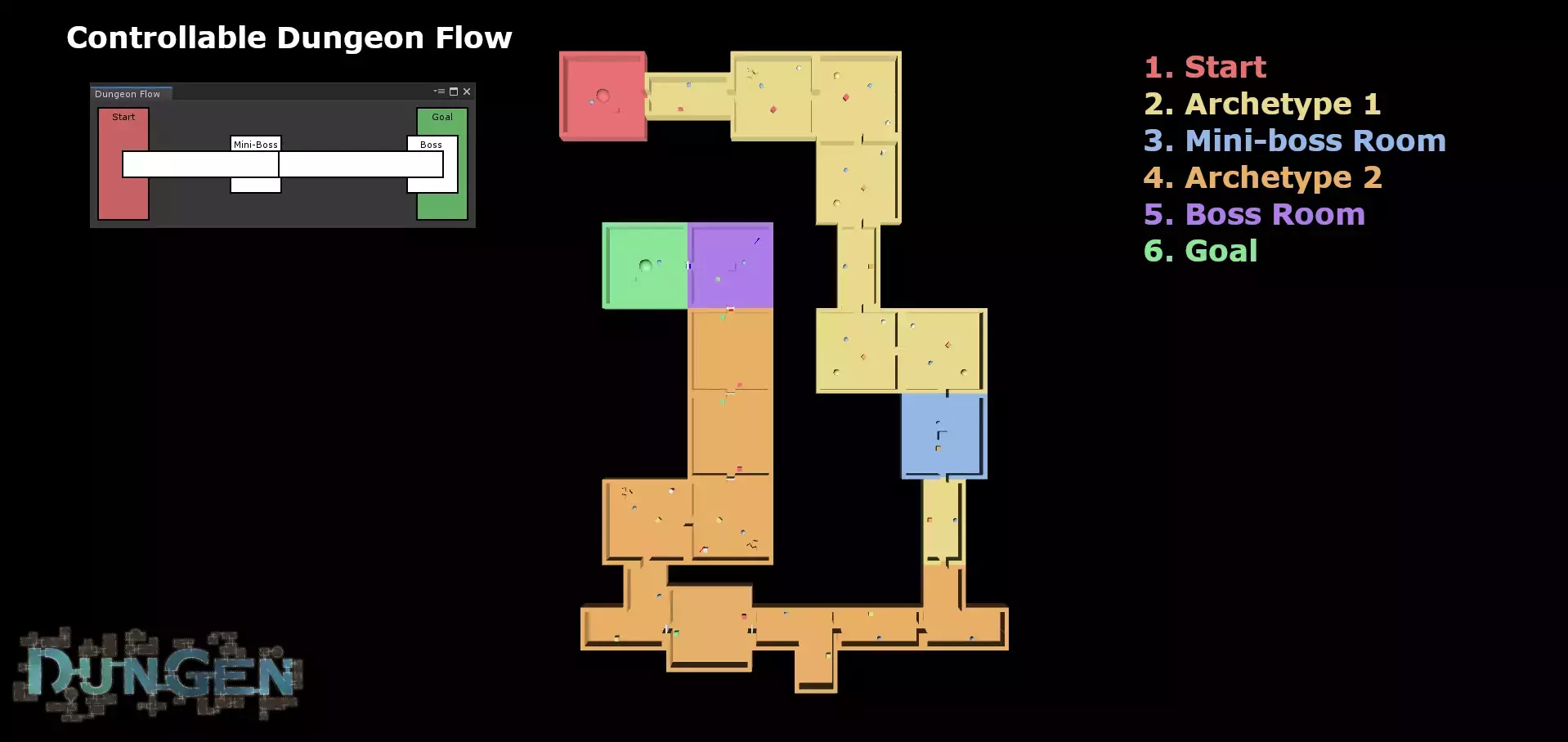 Мощные средства управления DunGen позволяют вам управлять процессом прохождения вашего подземелья. Например, вы можете создать подземелье, представляющее собой наполовину замок, наполовину кладбище, с мини-боссом посередине и комнатой босса в конце.