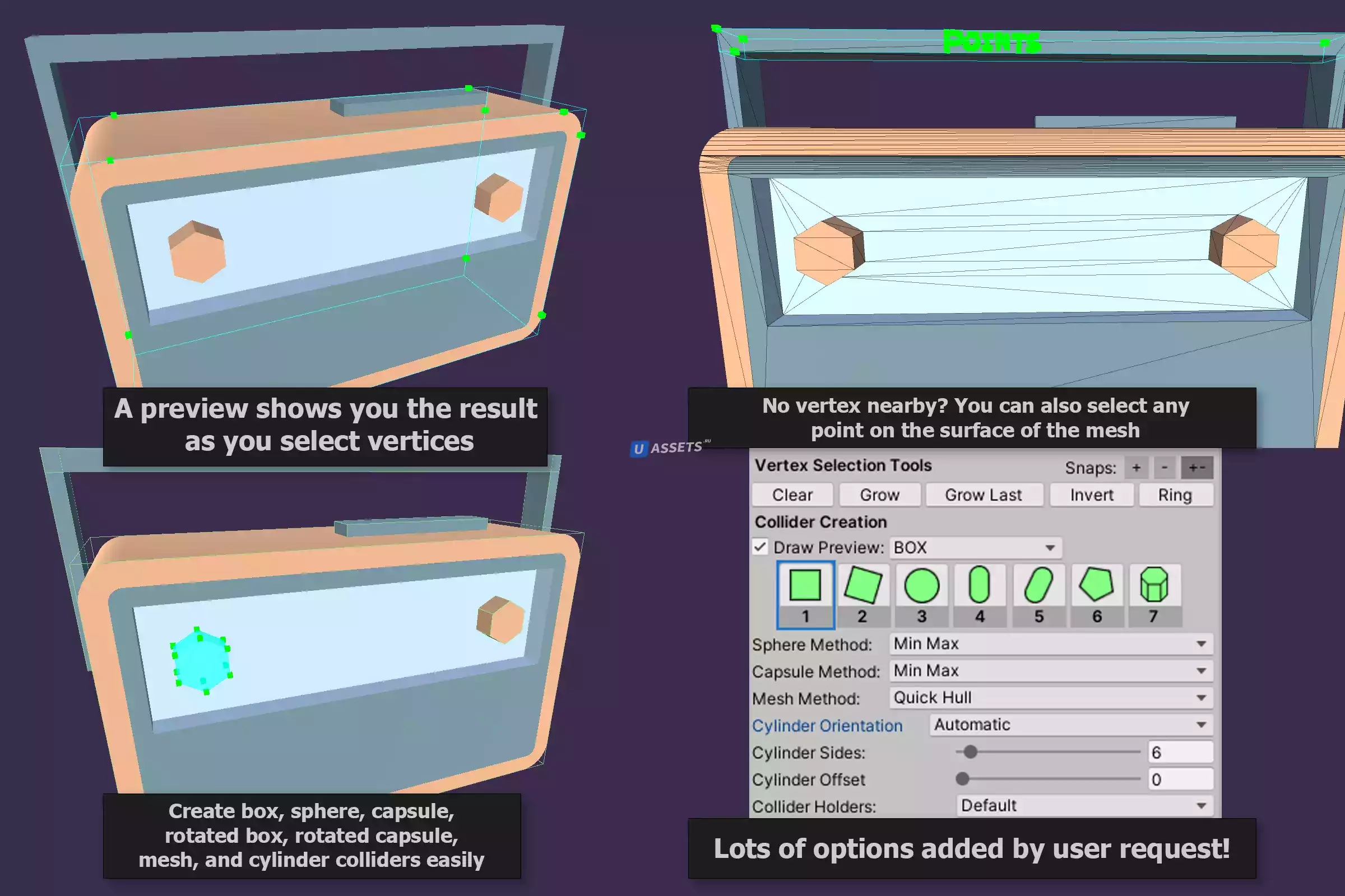 Простой редактор коллайдеров позволяет быстро создавать коллайдеры, подходящие для любого объекта. Просто выберите точки и вершины на сетке и нажмите кнопку или сочетание клавиш. Это так просто! Создавайте коробки, сферы, капсулы, цилиндры, повернутые коробки, вращающиеся капсулы и коллайдеры с выпуклой сеткой быстро и легко.