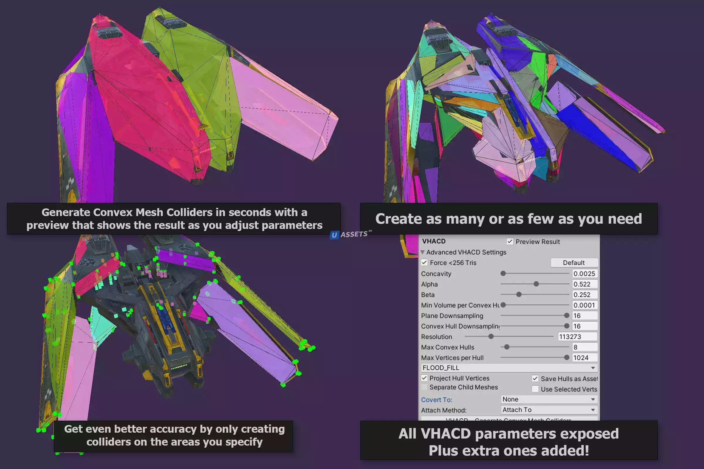 Еще одной функцией Easy Collider Editor является генерация выпуклой оболочки с использованием VHACD. Это позволяет автоматически создавать несколько коллайдеров выпуклой сетки на любой сетке простым нажатием кнопки. Использование нескольких коллайдеров с выпуклой сеткой позволяет лучше представлять форму сетки, сохраняя при этом корректную работу физики и жестких тел. Все параметры VHACD доступны и легко настраиваются, а предварительный просмотр результата вычисляется и отображается по мере работы. Дополнительные опции для VHACD позволяют использовать только выбранные вершины, обрабатывать сетки по отдельности и автоматически преобразовывать выходные данные в прямоугольники, сферы или капсулы.