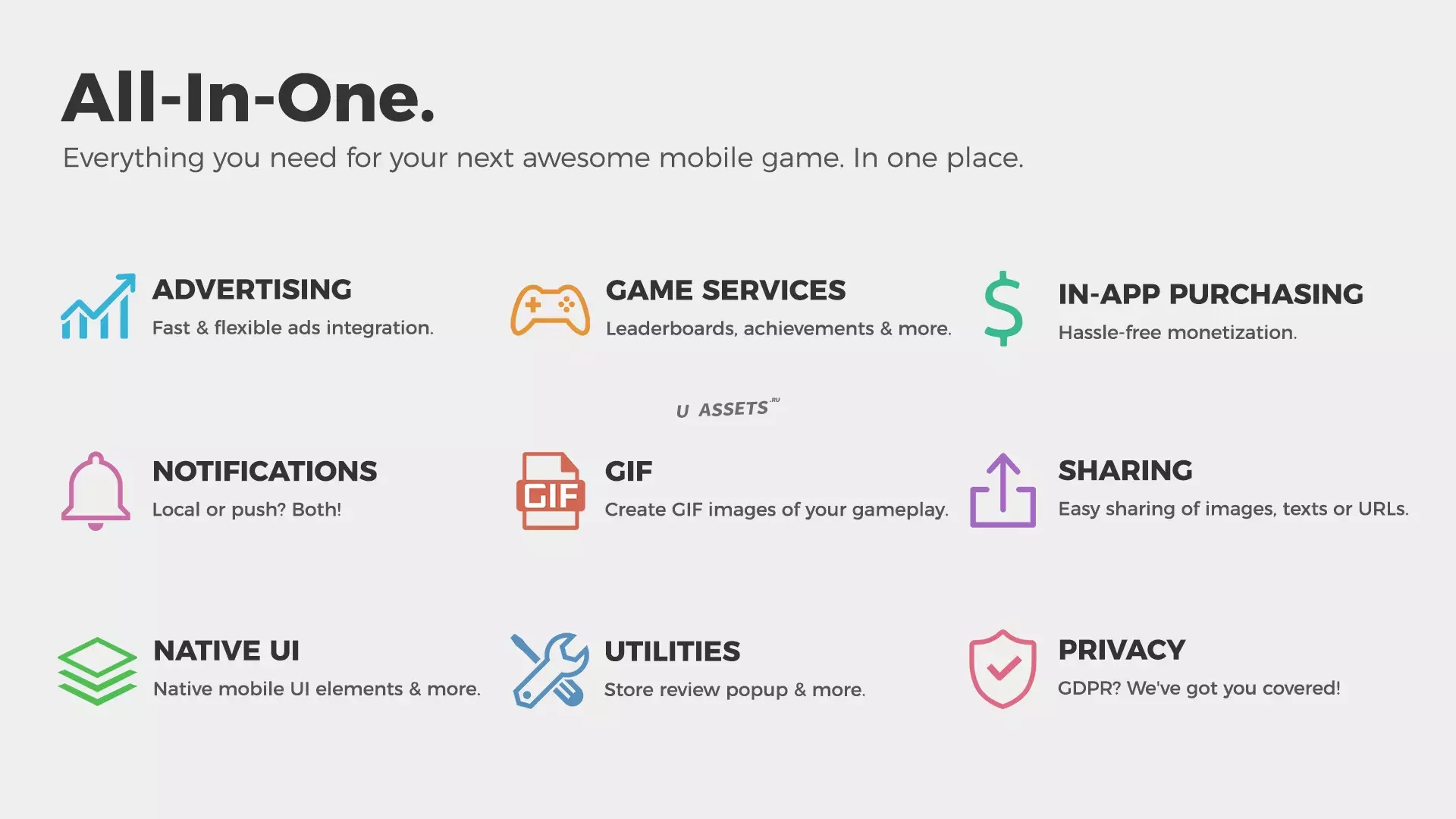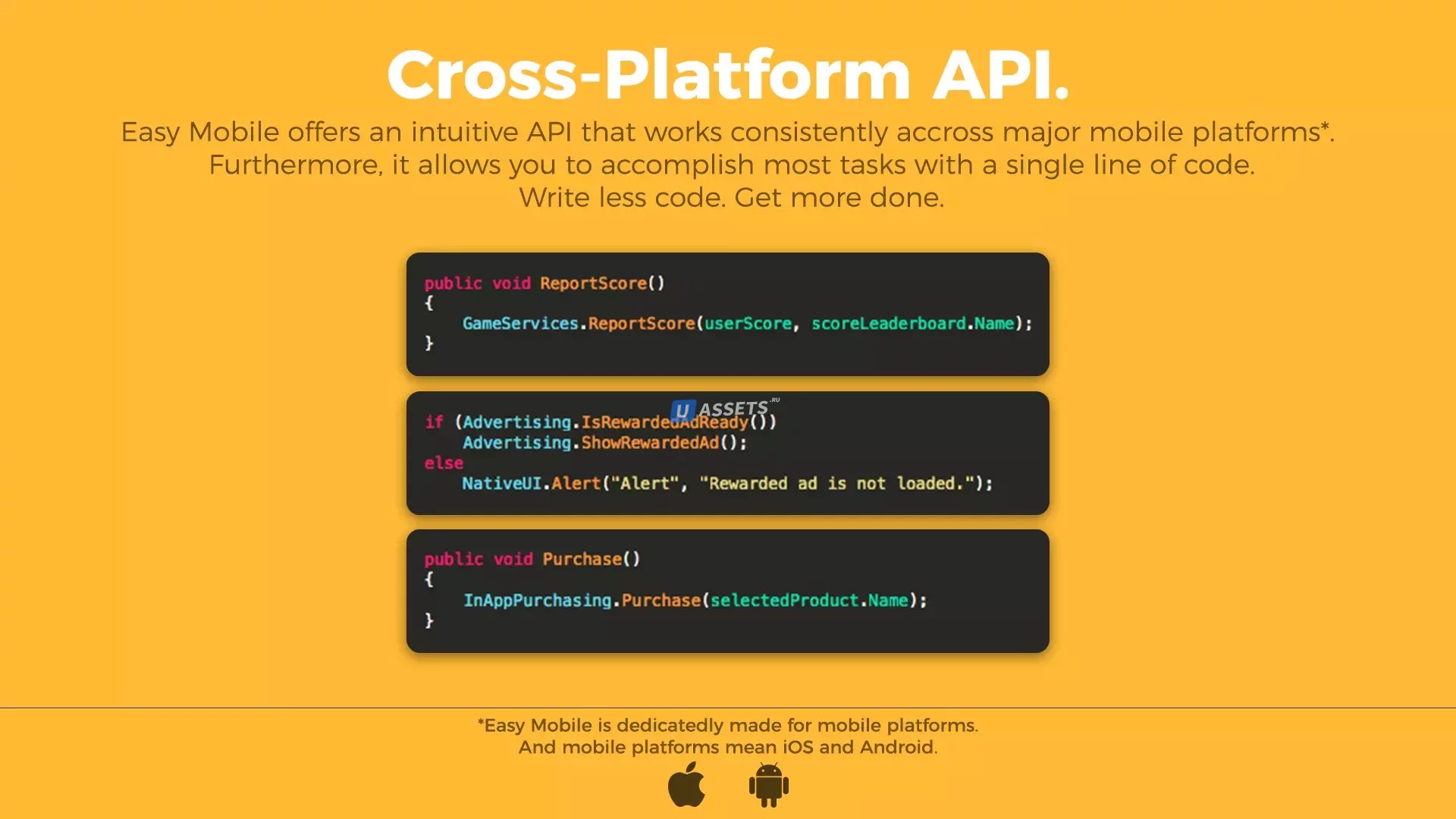 Easy Mobile Pro-это плагин "много в одном", который значительно упрощает реализацию общих функций в каждой мобильной игре, таких как реклама, покупки в приложении, игровые сервисы, уведомления, обмен и т.д. Наше видение состоит в том, чтобы создать стандартный пакет, который интегрирован в каждую мобильную игру Unity, заботясь обо всех "необходимых пороках", чтобы вы могли сосредоточиться на самом важном в разработке игр: создании удовольствия!