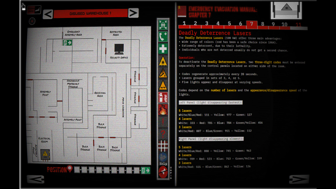 Он взаимодействует с контрольными панелями, управляя дверьми, системами пожаротушения и вентиляции, а также сверяется с аварийным руководством. По мере продвижения в игре Emergency Exit появляются более сложные загадки и препятствия, делая контроль времени критически важным. Оператор в диспетчерской должен также следить за расходом электроэнергии, так как каждый активированный механизм потребляет ценный заряд. Разные уровни сложности добавляют дополнительные ограничения, требуя от дуэта безупречной координации и коммуникации.