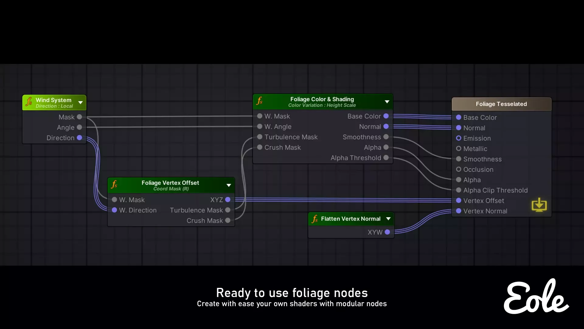 Создавайте удивительные стилизованные изображения листвы вместе с людьми, включая простую поддержку системы wind. Шейдерные узлы разработаны с учетом пользовательского интерфейса для настройки вашего собственного шейдера листвы.