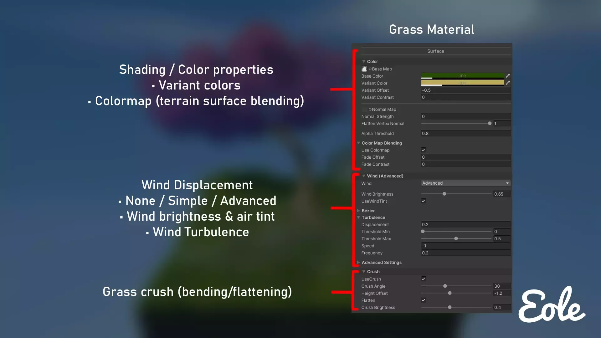• Различные анимации ветра в листве, включая технику кривой Безье для большего контроля и реалистичности