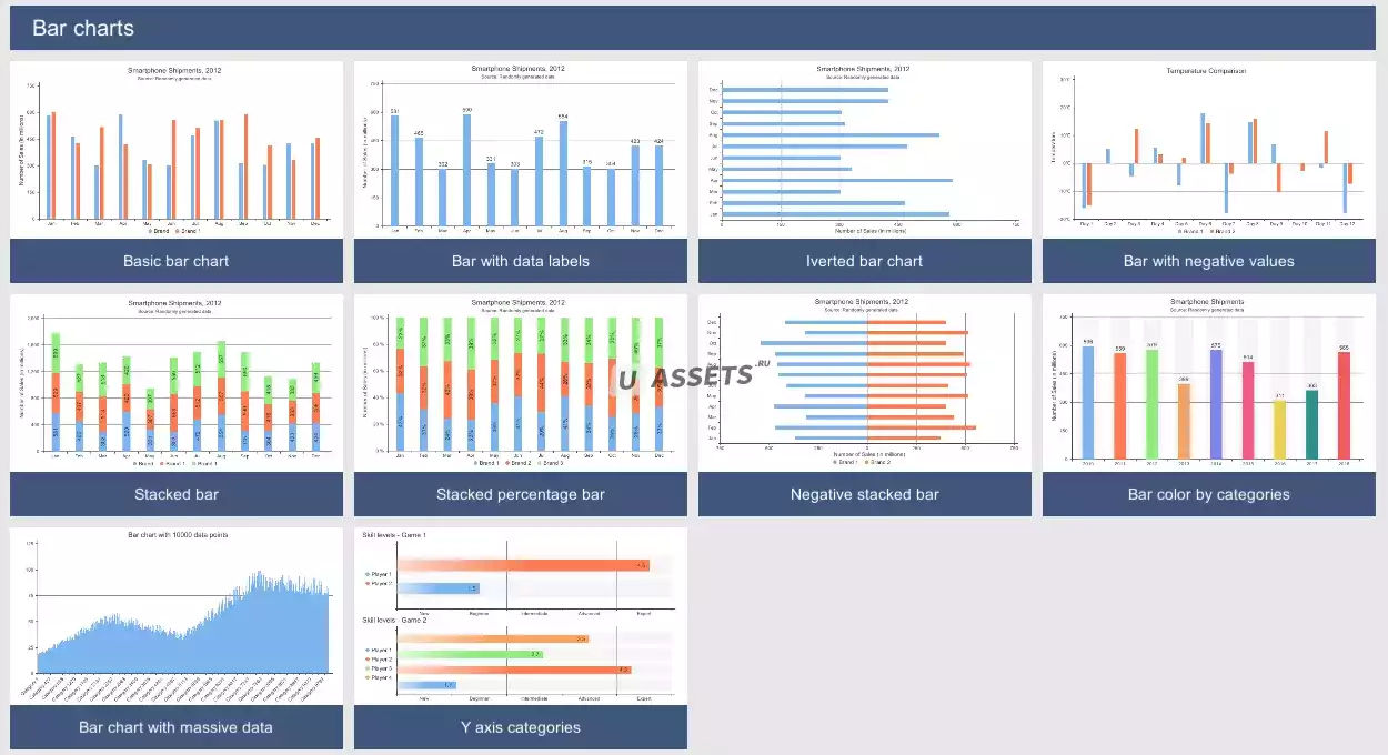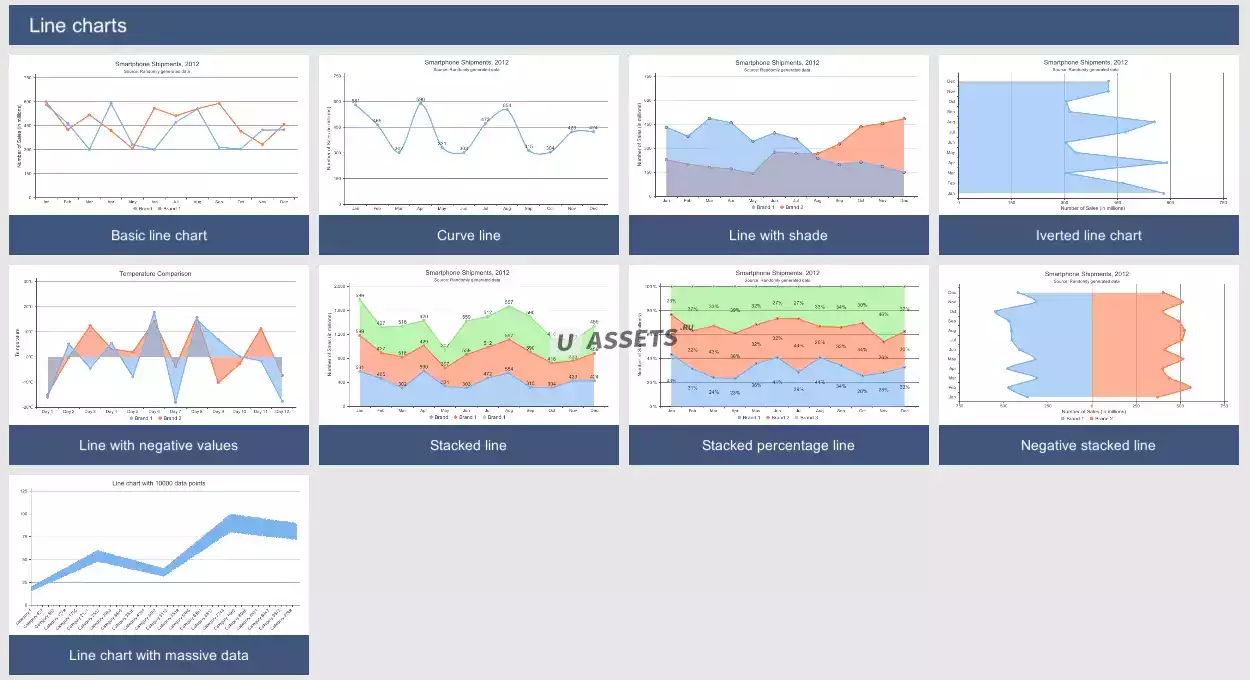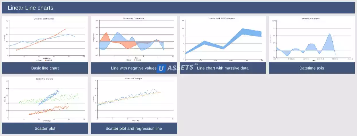 - Поддержка круговой диаграммы, столбчатой диаграммы, линейной диаграммы, розовой диаграммы, радарной диаграммы, датчика и сплошного датчика.