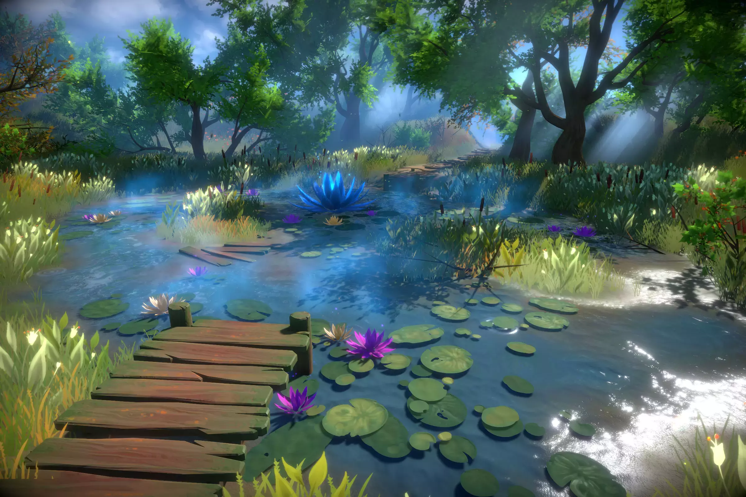 Небольшой набор, содержащий различные реквизиты, которые помогут создать красивые фэнтезийные пейзажи, такие как леса или обширные поля. Трава создается непосредственно с помощью рельефа Unity, а растительность - с помощью стандартного создателя Unity «Дерево»; это поддерживается только встроенным RP. Текстуры нарисованы вручную, чтобы придать стилизованный вид.