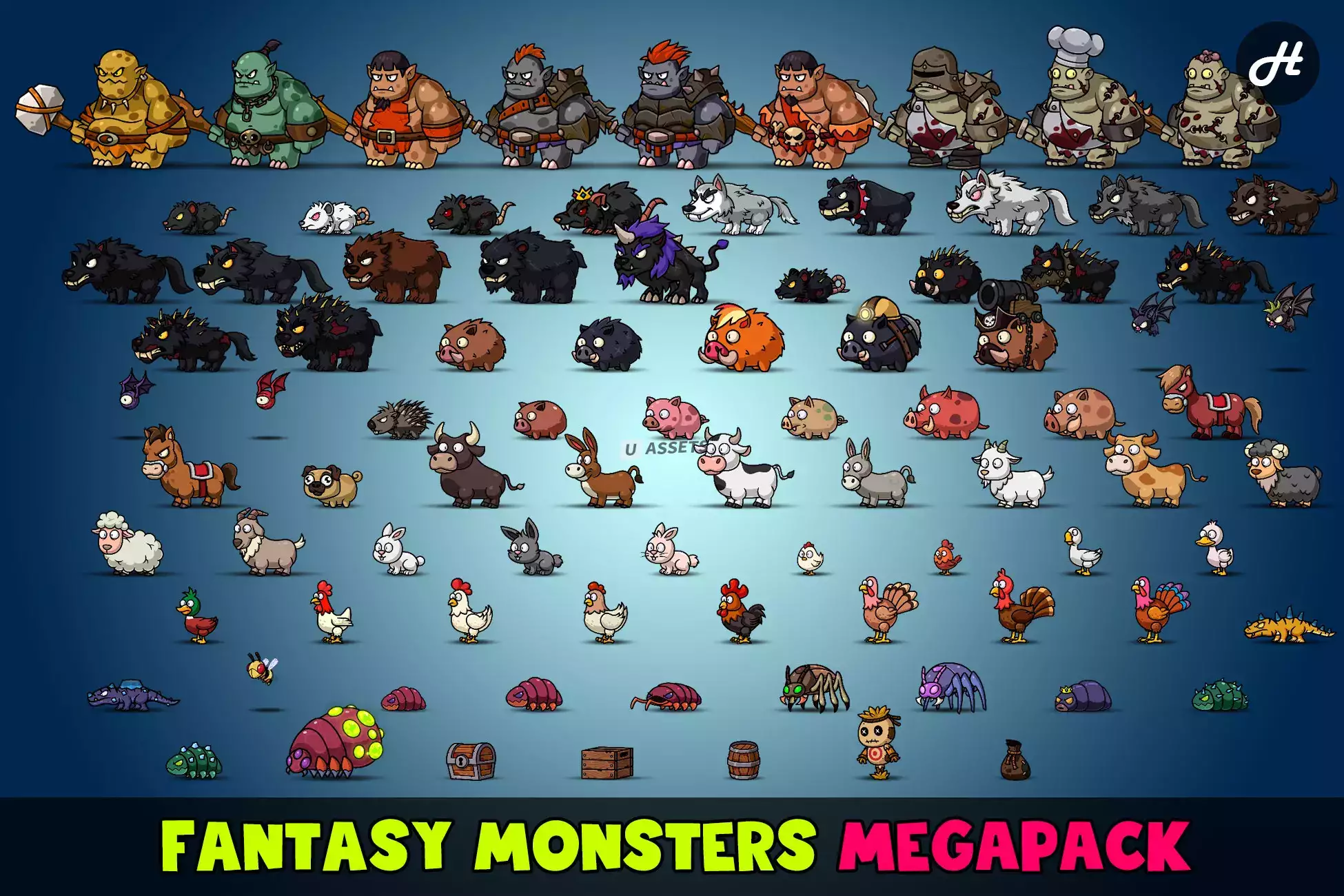 Фэнтезийные монстры - это наш новый актив с анимированными монстрами. Пакет Megapack включает в себя следующие пакеты: Деревенские животные, Лесные монстры, Пещерные монстры, Гигантские животные, Одержимые монстры, Неодушевленные монстры. Используйте его с редактором героев или редактором героев 4-Directional, чтобы создать свою потрясающую игру!