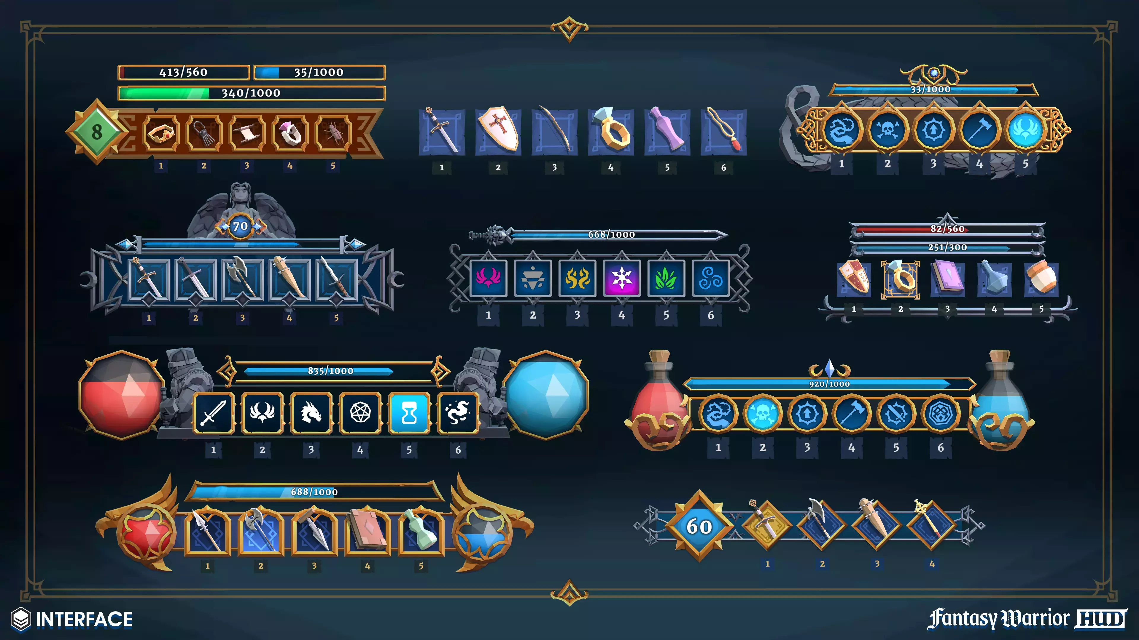 Значки с реквизитом и оружием в этом наборе HUD созданы на основе предметов и оружия, найденных в POLYGON Fantasy Kingdom, что идеально подходит для Fantasy Warrior HUD.