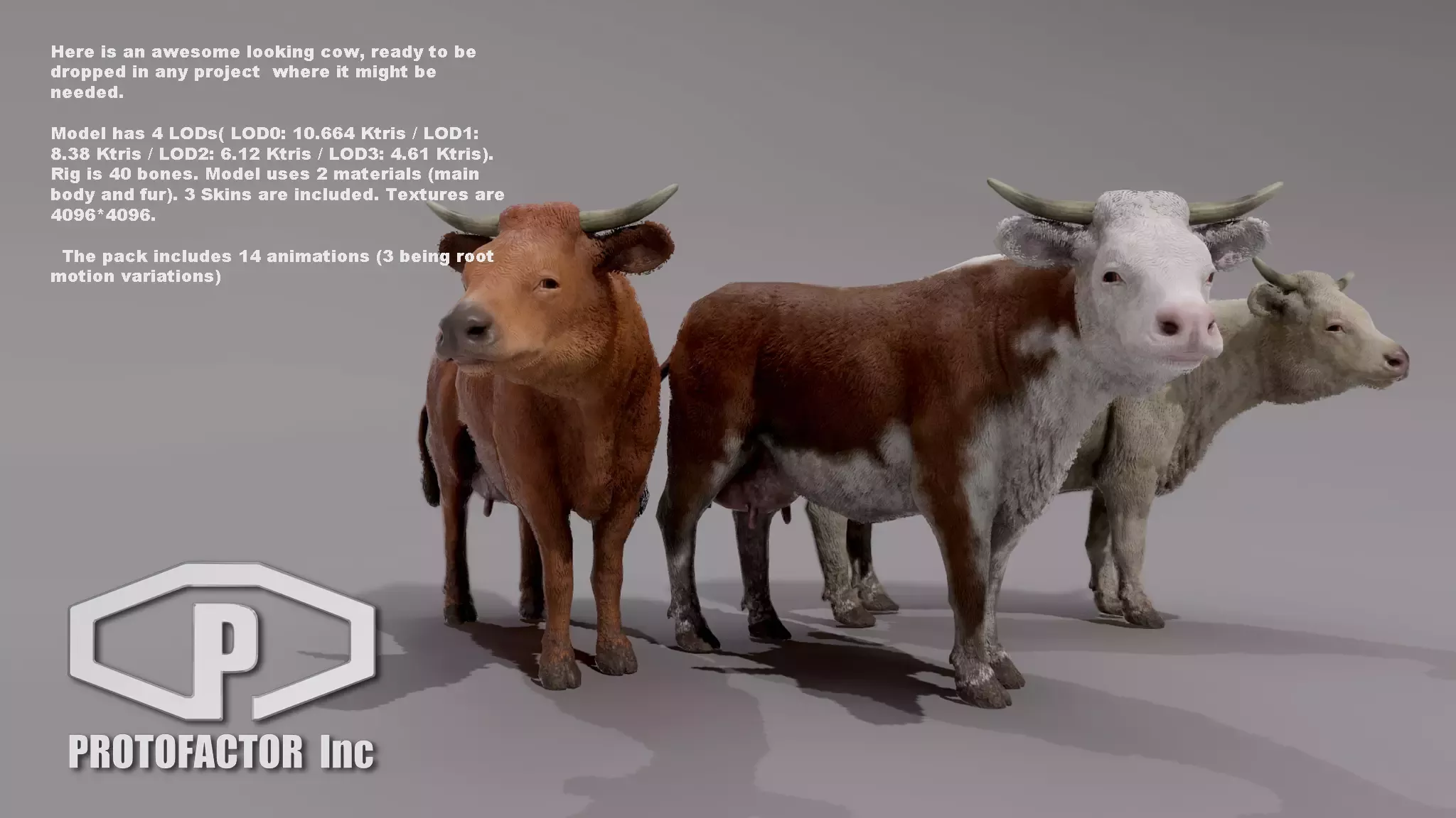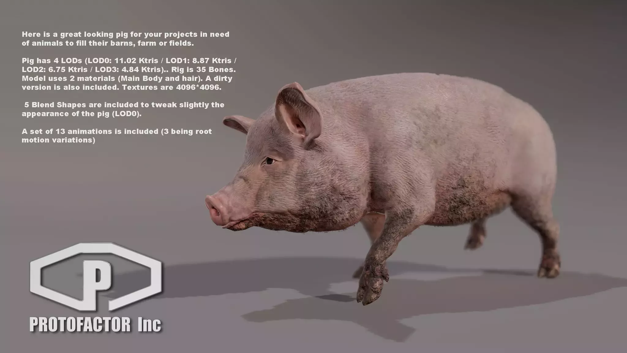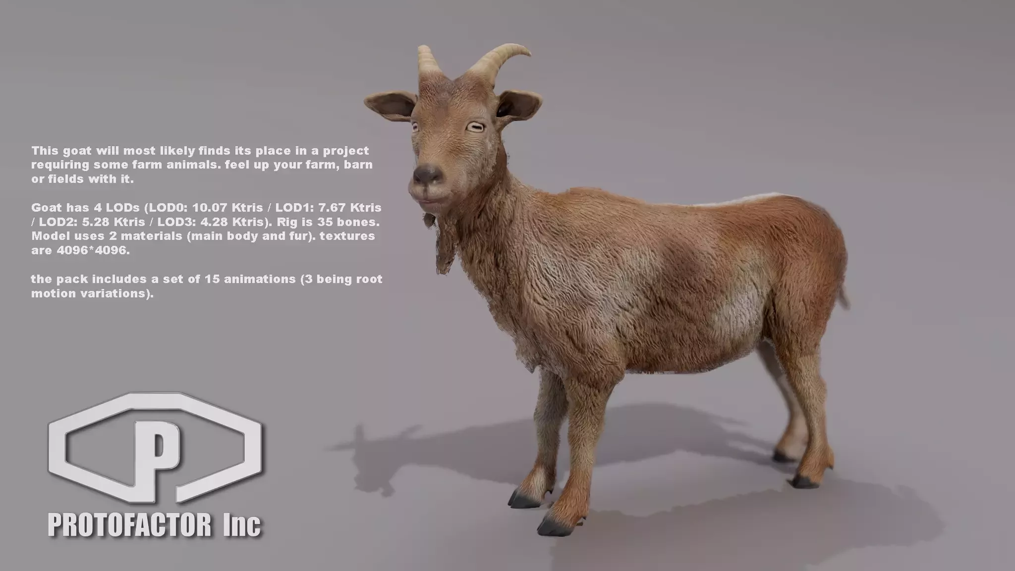 Модели рассчитаны от 4 попыток до 11 тысяч трис (для LOD0) и от 2,35 попыток до 4,84 Ctrip (для самого низкого LOD).. Пакет предлагает поддержку как PBR, так и устаревших шейдеров. Установки настроены на mecanim generic. Набор анимаций включает в себя вариации движения на месте и в корне.