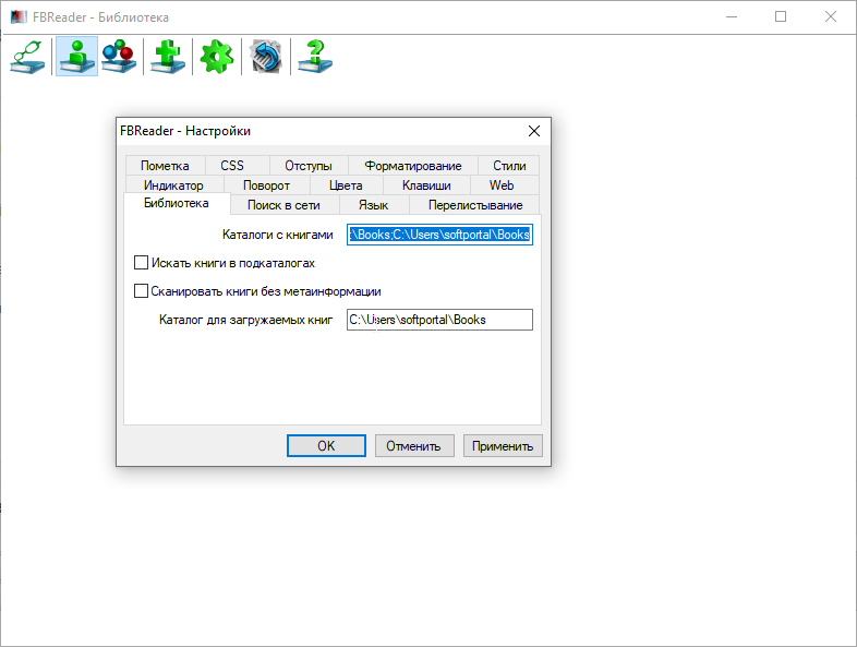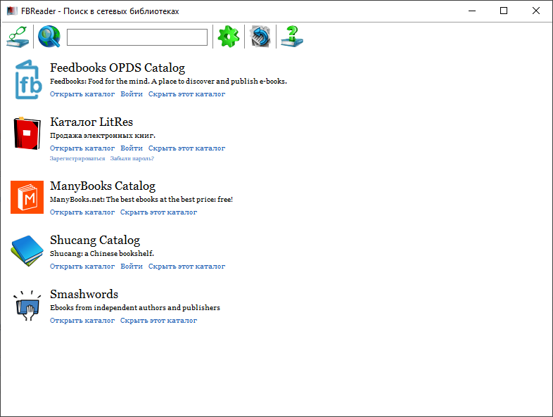 Кроме открытия файлов с компьютера, программа позволяет покупать и читать книги с встроенных онлайн каталогов, таких как Litres, OPDS, Many Books, Shukang, Smashwords.