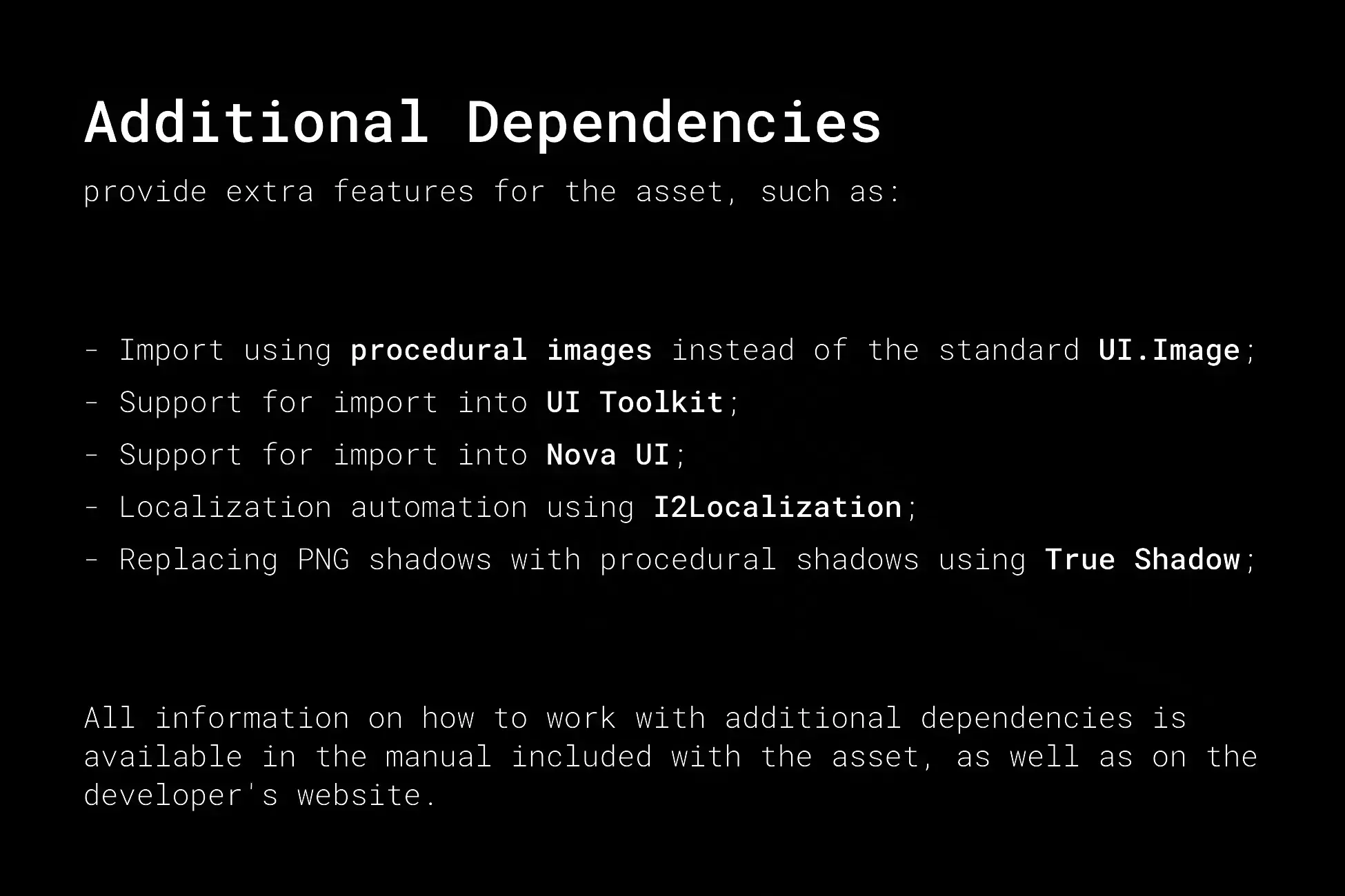 - Работает с дополнительными активами из вкладки "Зависимости";