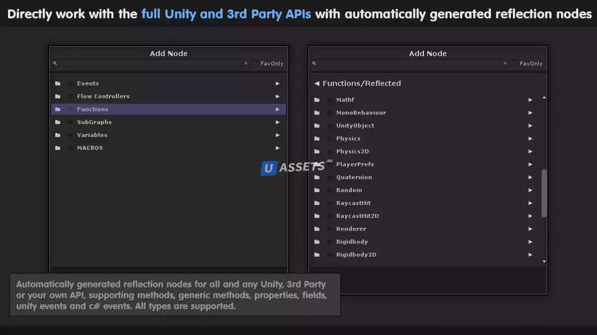 ● Автоматически генерируемые узлы для всех функций Unity, вашего кода и сторонних API.