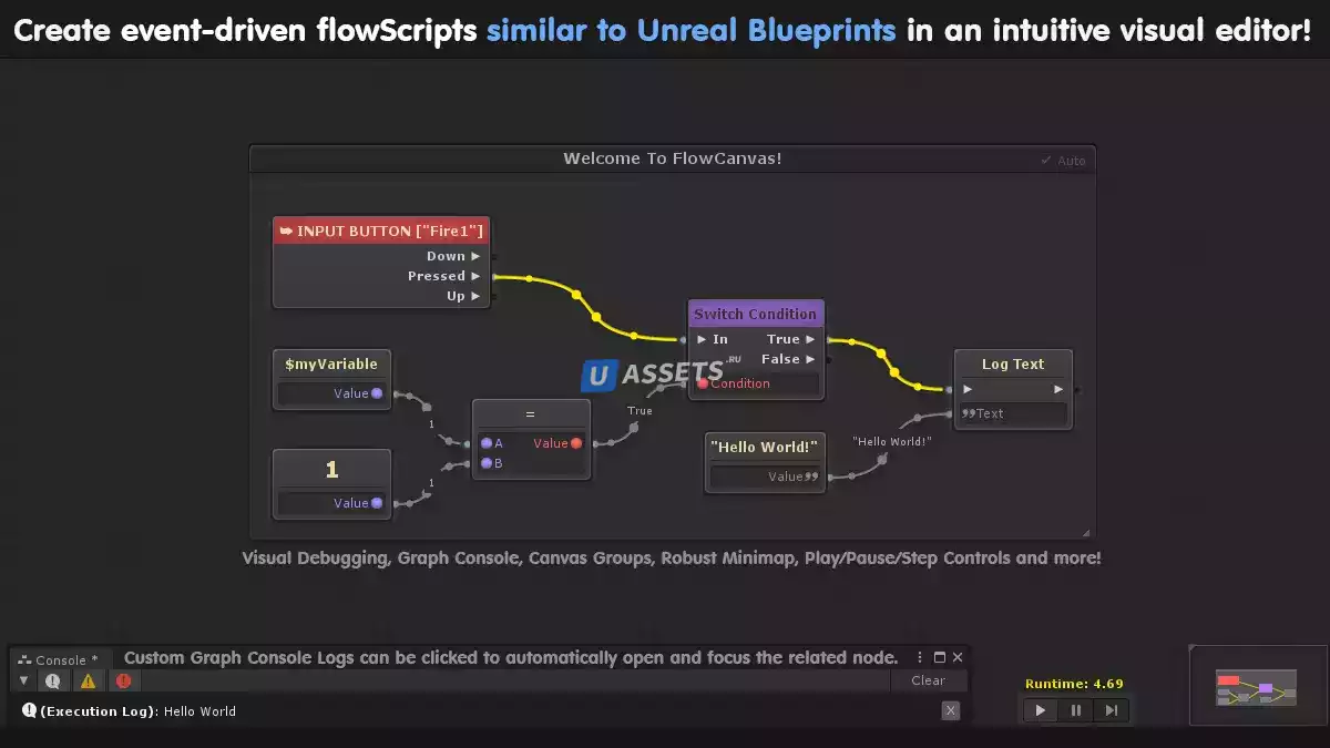 FlowCanvas - это мощное и многофункциональное решение для создания визуальных сценариев для Unity, позволяющее вам создавать практически любые элементы игрового процесса для ваших игр и манипулировать ими очень похоже на Unreal Blueprints, но при этом требуется гораздо меньше знаний в области программирования.
