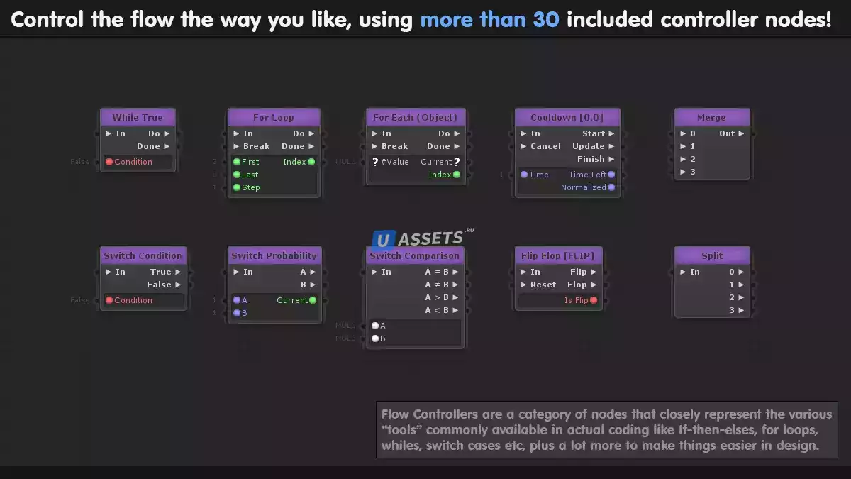● Более 30 встроенных узлов управления потоком.