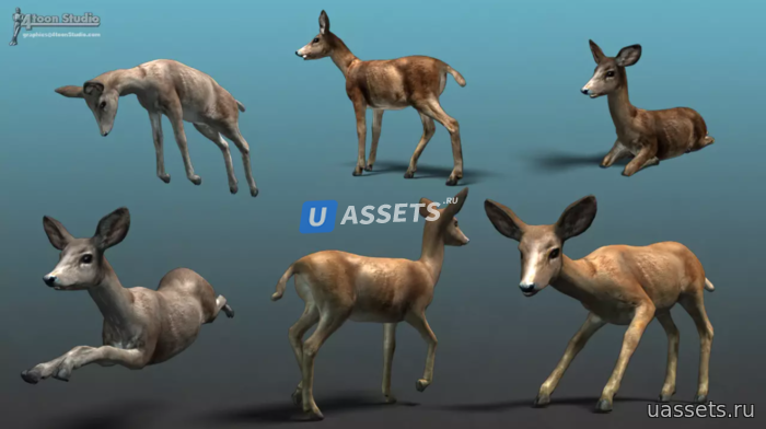 •Олененок (молодой) - SHP 13688/HP 3650/LP 2104 трис, 36 Костей, 3 Цветные Текстуры, 1 Нормальная, 1 Зеркальная Карта (все 2k/4k), 22 Анимации (на месте и в корне);