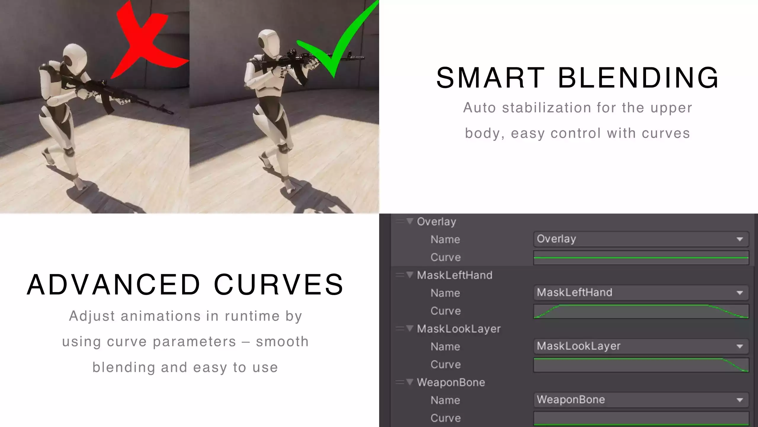 - Dynamic Animator: забудьте о добавлении множества состояний и слоев в аниматор — просто воспроизводите клипы и позы из кода с плавным смешиванием.