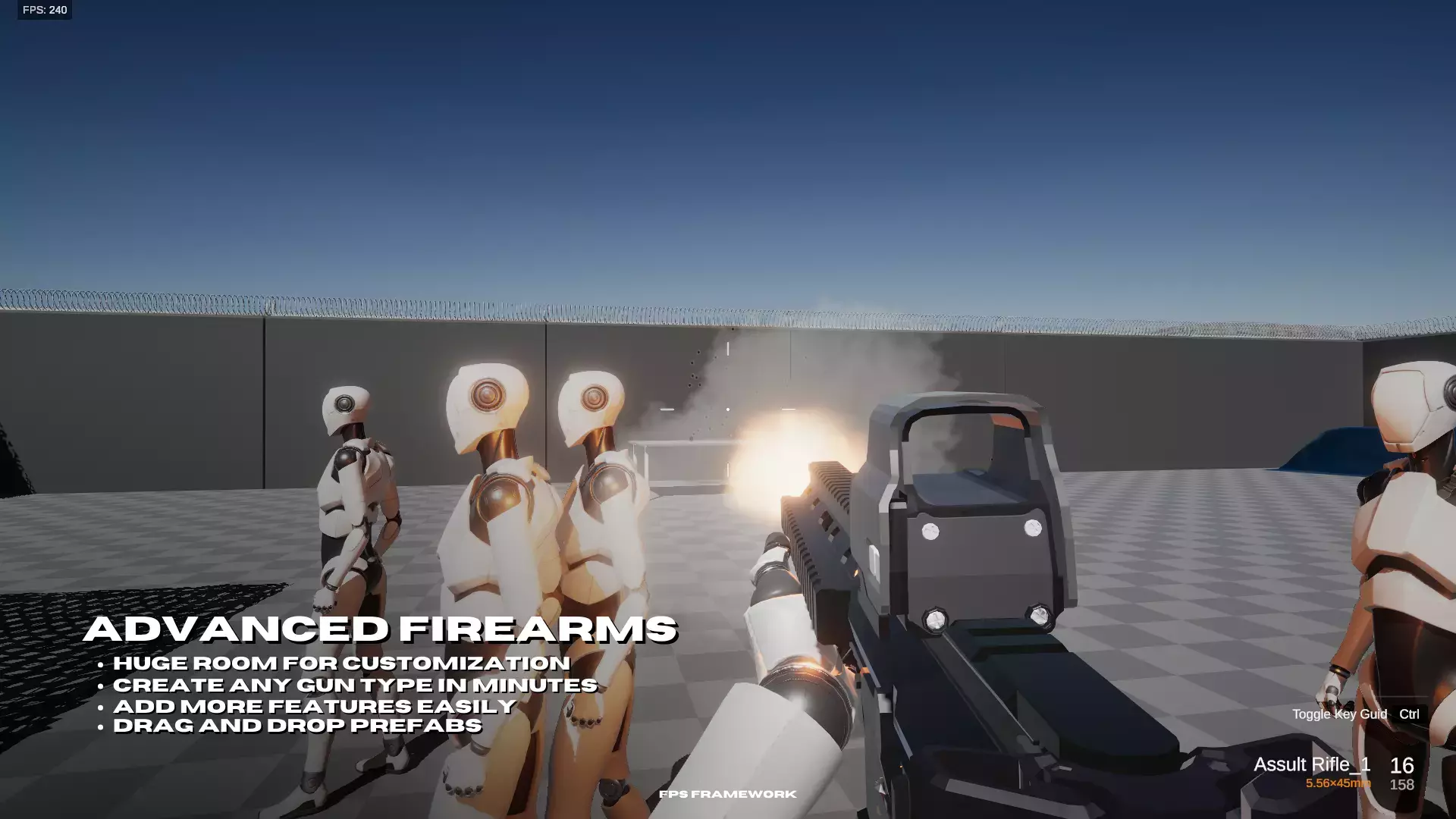 - Богатая функциями система огнестрельного оружия: Система огнестрельного оружия в фреймворке многофункциональна и проста в использовании. Она также модульная, как и все остальное. С помощью системы огнестрельного оружия вы можете создать практически любой тип оружия.