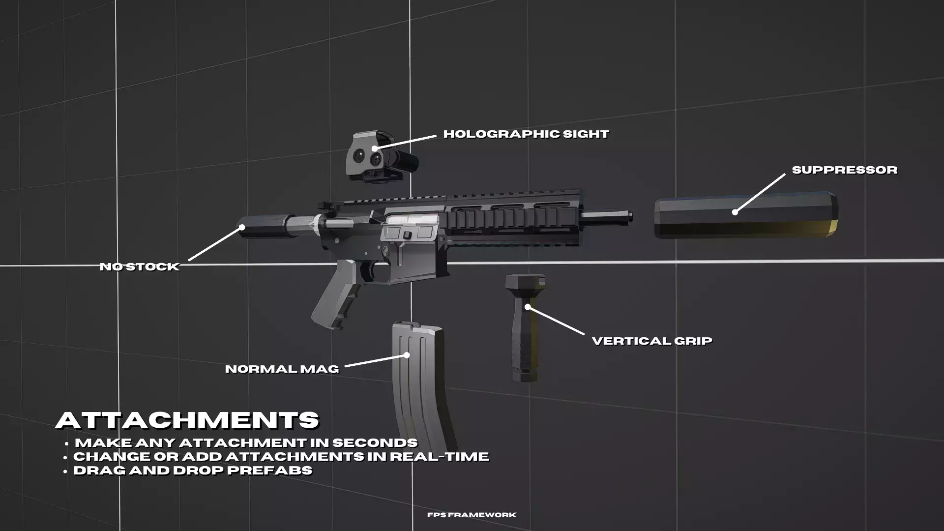- Система модульных насадок: Система огнестрельного оружия может иметь насадки, которые влияют на оружие по вашему заказу. Добавление насадок - очень простой и быстрый процесс.