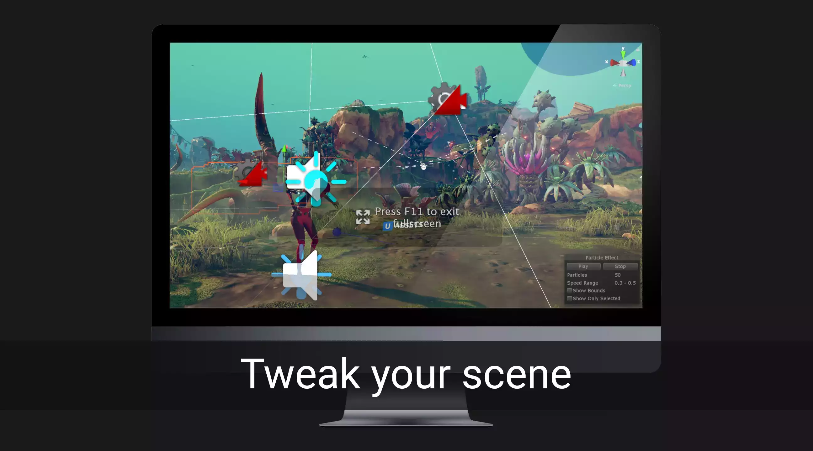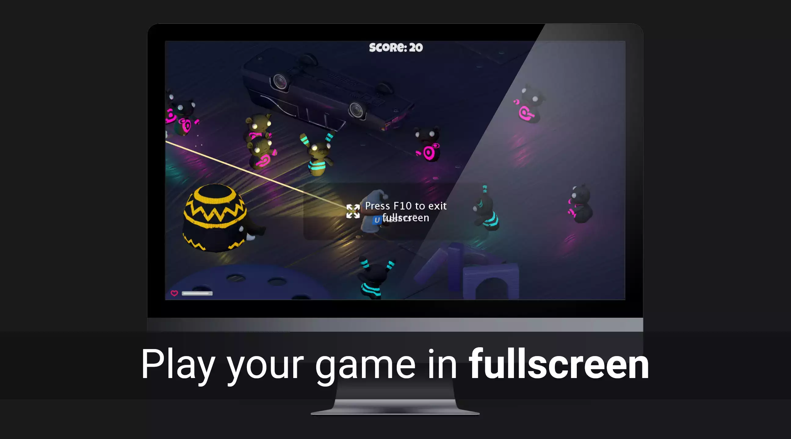 Играйте, разрабатывайте, тестируйте и записывайте свою игру в полноэкранном режиме прямо из редактора.