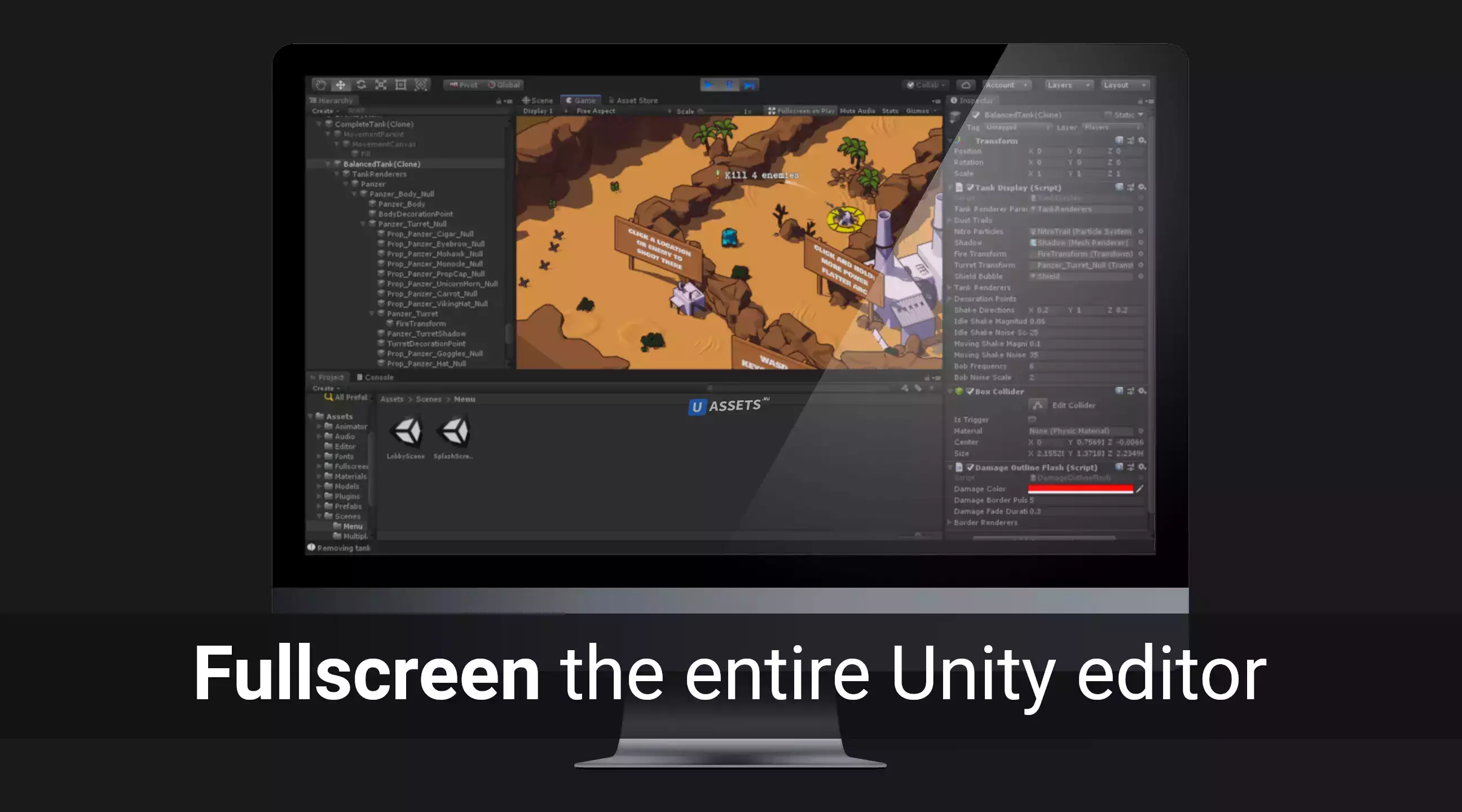 Расширение, которое делает то, о чем говорит его название, оно переводит окна редактора в полноэкранный режим, простой и понятный, полезный для записи, тестирования в реальной игровой среде и настройки вашей сцены.