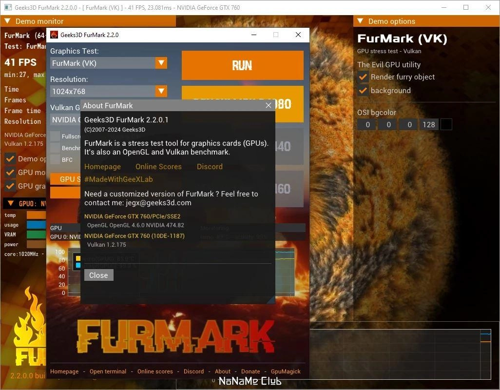 FurMark 2.2.0.1 — это мощный инструмент для стресс-тестирования и оценки производительности графических процессоров. Программа является преемником классического FurMark 1 и предлагает интенсивную нагрузку на GPU, а также быстрые графические тесты с поддержкой API OpenGL и Vulkan, включая возможность онлайн-сравнения результатов.