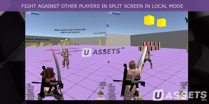 • Система ближнего боя: позволяет выполнять комбо, специальные атаки, атаки по воздуху, блоки мечом/щитом, кувырок/уклонение, идеальные блоки, система реакции на удар, бросок/возврат оружия, способность деформации, активация режима нарезки, лук/стрелы с эффектами (яд, огонь, вода, успокоительное, взрывчатка, ...), захватом цели, факелами с механикой огня/головоломками и многим другим, включая мозг ИИ для ближнего боя! Стреляйте снарядами из оружия ближнего боя, такого как волшебные предметы или винтовочные / пистолетные мечи!
