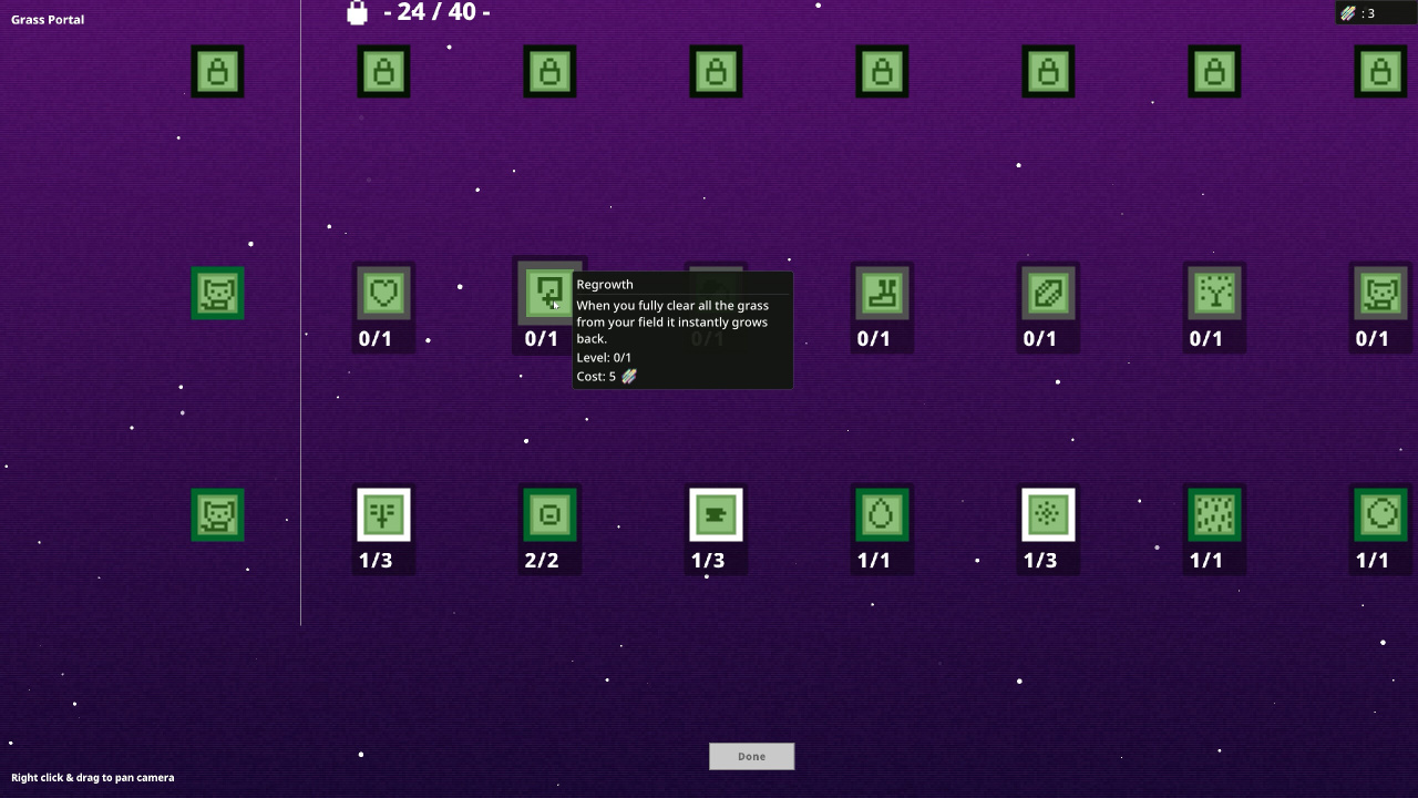 По мере совершенствования лужайки она начинает привлекать тысячи посетителей и различных животных, добавляя новый аспект в симуляцию. Эти элементы вводят стратегические решения о распределении ресурсов по всему земельному наделу. Для облегчения процесса расчистки земли доступен выбор приспособлений и даже оружия. Продвижение идет по прямому пути через покупку модернизаций, влияющих на количество и качество растительного покрова. Этот цикл стрижки, заработка и апгрейдов формирует основную механику инкрементального проекта. Продвижение отмечается целью заполучить каждый доступный предмет и улучшение в рамках этого тайтла.