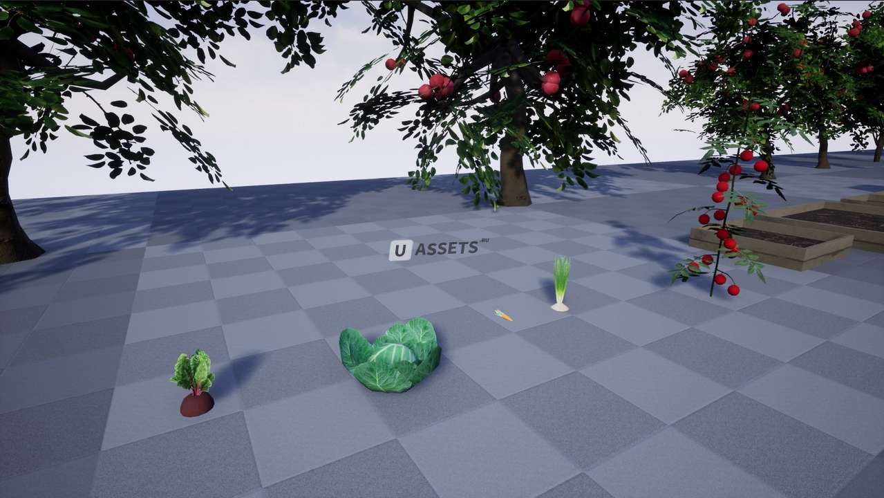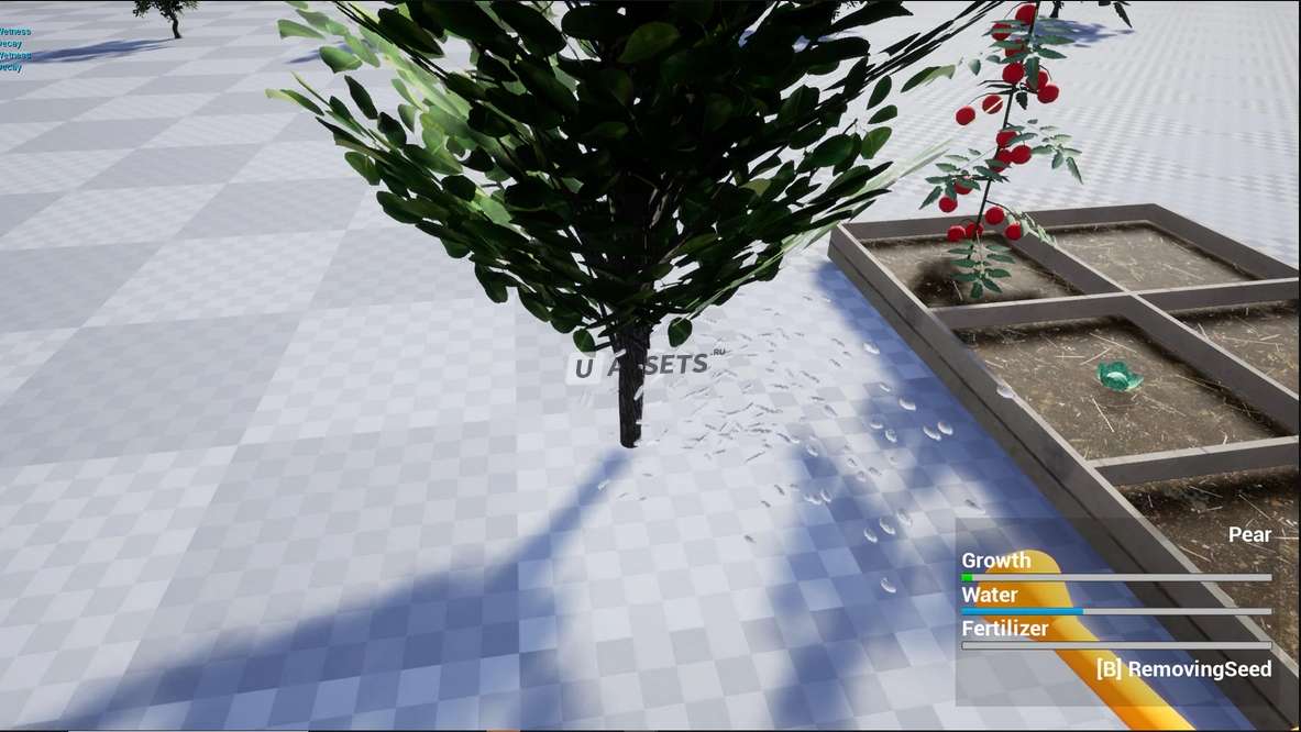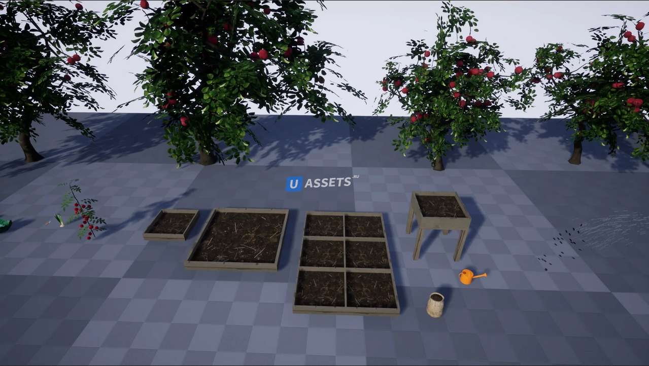 — Растения, грядки, лейка с мешком удобрений и 2 системы частиц