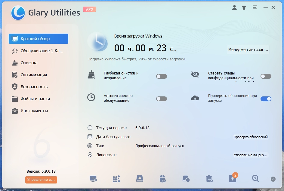 Использование Glary Utilities Pro 6.9.0.13 Portable by FC Portables позволяет комплексно подойти к обслуживанию ПК, объединив множество необходимых инструментов в одном удобном интерфейсе с поддержкой русского языка. Пакет оптимизирует работу с памятью, повышает уровень защиты и помогает поддерживать систему в чистоте и порядке.