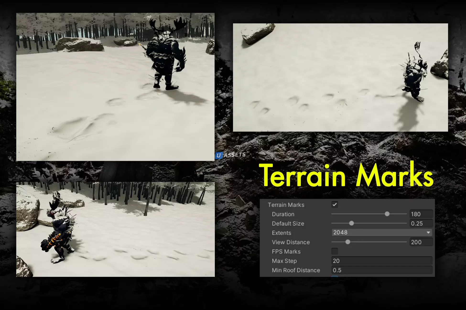 Отметки местности. Обнаруживает столкновения на местности, добавляя метки на снегу на любом движущемся игровом объекте. Также обнаруживает столкновения колес, отлично подходит для транспортных средств на снегу (см. скриншоты).
