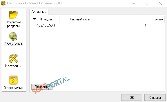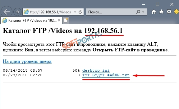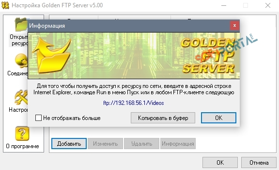 После того программа будет запущена и папка указана, во вкладке “открытые ресурсы” появится список папок доступных удаленно, в том случае если у вас “белый IP”, если серый или вы находитесь за маршрутизатором просто так зайти не получится, например, в случае с маршрутизатором необходимо пробросить порт 21, на локальный компьютер. Конечно внутри своей локальной сети вы легко получите доступ к ресурсам, в моем случае это 192.168.56.1.