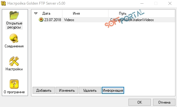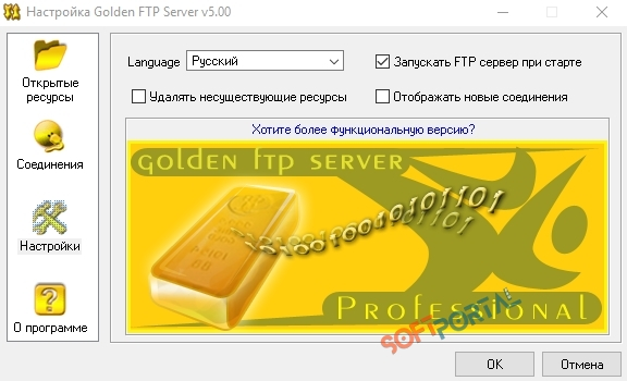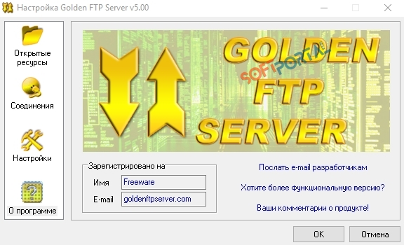 Golden FTP pro – Небольшая программа рассчитанная на быстрый и несложный запуск собственного фтп сервера на домашнем компьютере windows. Обычно настройка собственного фтп сервера для новичка это головная боль, нужно изучить много материалов, параметров, и логику работы в целом. Так вот Golden FTP Сервер создан для того что бы избавить нас от головной боли и запустить сервер буквально за 1 минуту, для этого необходим всего лишь установить и запустить программ, указать папку где будут лежать наши файлы, на скриншотах все видно.
