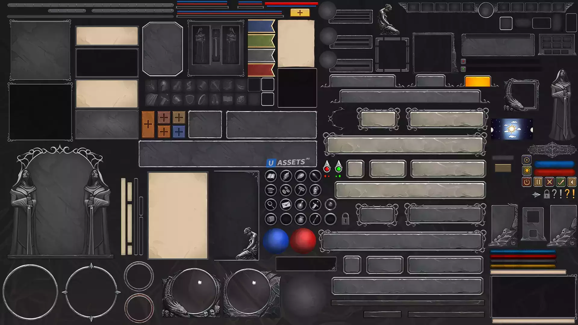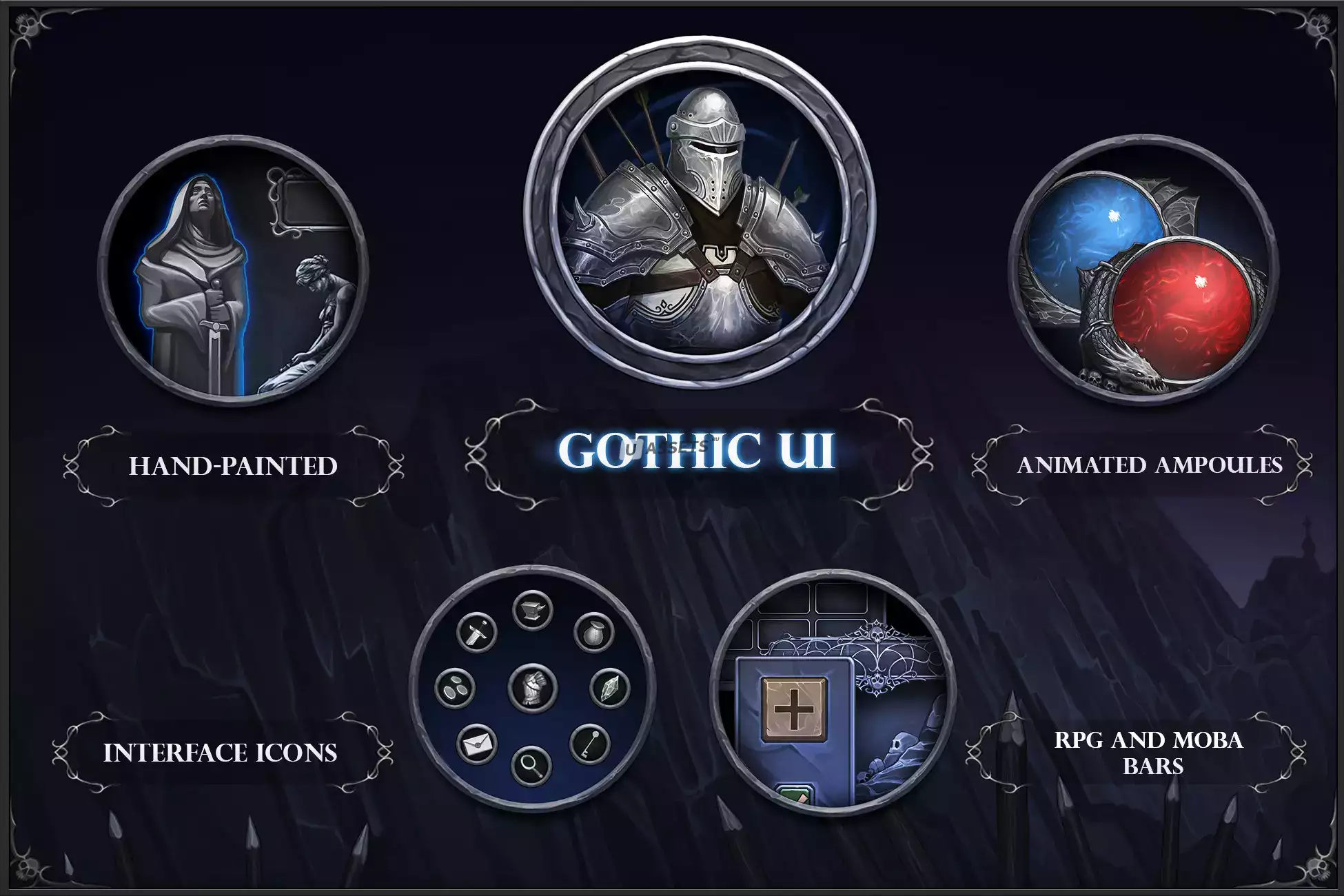 Все элементы раскрашены вручную и идеально подходят для игр в темном стиле.Этот набор был разработан для игр PRG, Action, Moba, он включает в себя все основные элементы для игрового интерфейса в этом жанре, такие как: меню, hp / mana /energy bars, инвентарь, кнопки и т. д.