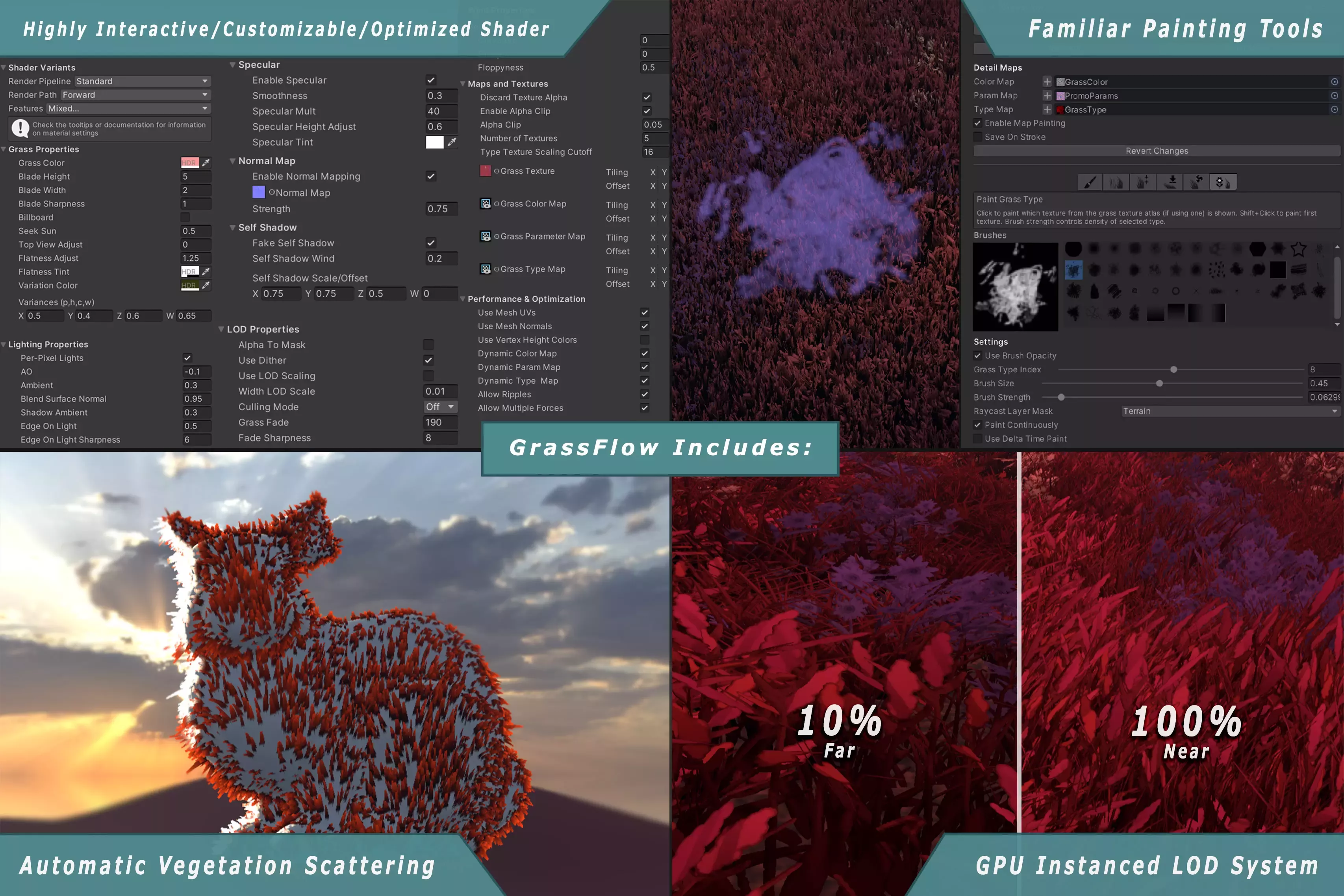 Grass Flow - это полноценная система растительности, основанная на высокоинтерактивном / настраиваемом / оптимизированном шейдере.
